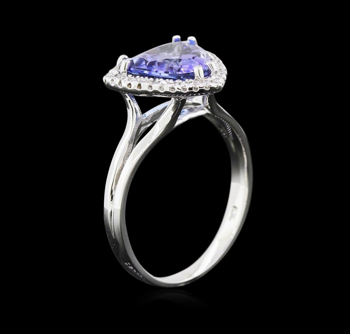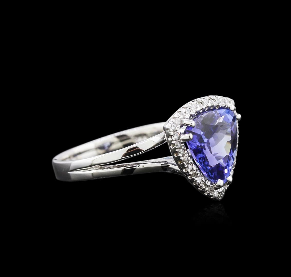 One stamped & tested 14KT white gold lady's cast cocktail ring with a split shank with a bright polish finish. Condition is new. Containing: One prong set triangle modified brilliant cut natural tanzanite, measuring 9.45 x 9.16 x 5.57mm, approximate weight of 2.88ct., clarity is eye clean, type I, medium dark, very slightly grayish, bluish violet color, (GIA bV 6/3), cut is very good. Thirty-four prong set round brilliant cut diamonds, measuring 1.10 - 1.00 x 0.63mm (depth est.) approximate total weight of 34 Stones = 0.15ct. Clarity: SI-1 to I-1. Color: H - I. Cut: Good. Total Weight of Colored Stones: 2.88ct. Total Weight of Diamonds: 0.15ct. Total Weight of Ring: 3.90 gm. GAS Appraised at $5,475.00.