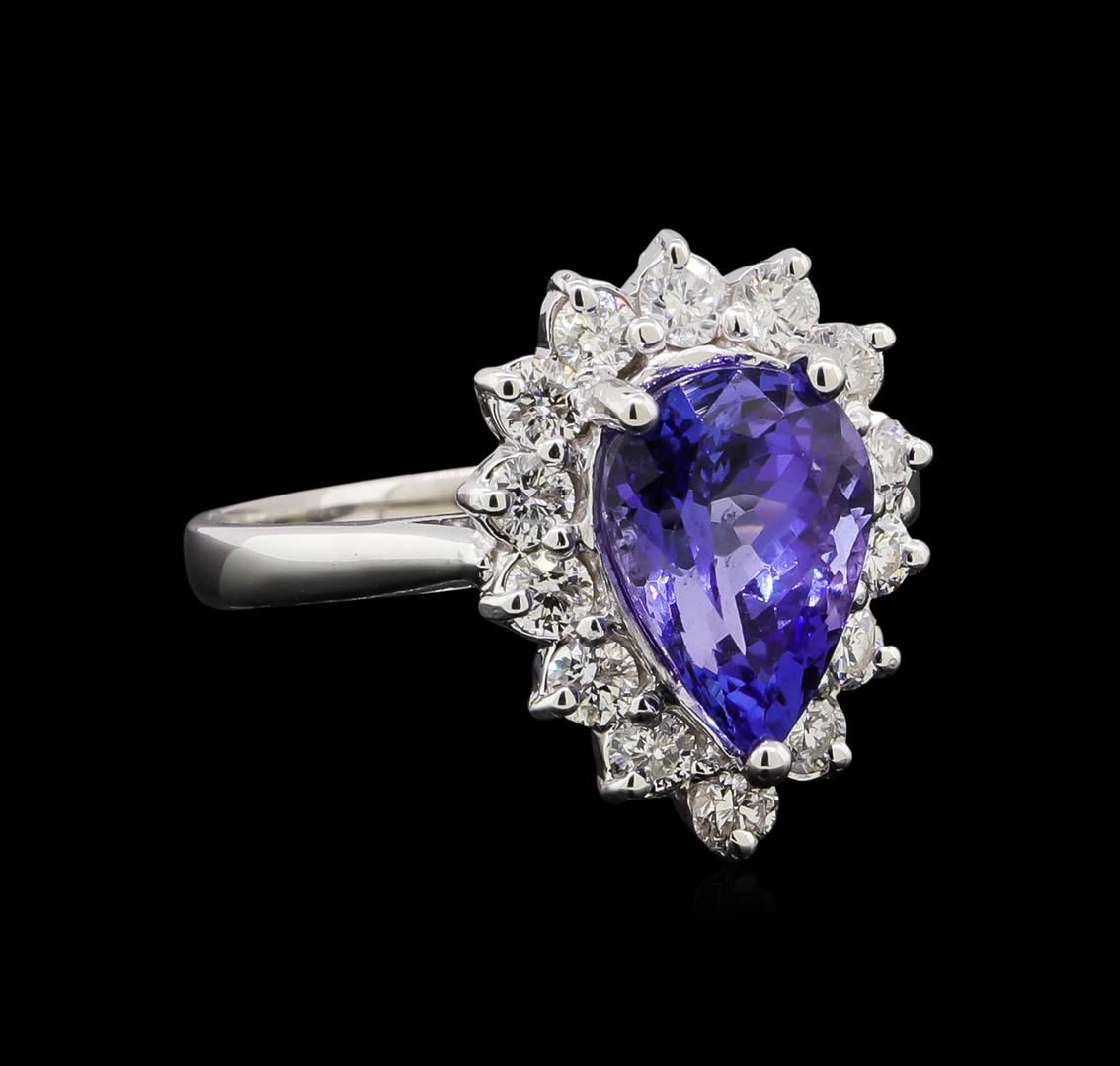 One electronically tested 14KT white gold lady's cast fashion ring with a basket halo with a bright polish finish. The featured lady's ring has a shank measuring 1.97 millimeters in width. Identified with markings of 'K14'. Condition is new, good workmanship. Containing: One prong set pear modified brilliant cut natural tanzanite, measuring 10.10 x 7.25 x 6.15mm, (depth est.) approximate weight of 2.88ct., clarity is eye clean, medium dark, moderately strong, bluish violet color, (GIA bV 6/4), cut is very good. Transmitting light with no distortion, transparent. Colored gemstones are presumed to have been subjected to commonly used enhancement processes. Graded in the setting. Fourteen prong set round brilliant cut diamonds, measuring 2.40 - 2.35 x 1.48mm (depth est.) approximate total weight of 14 Stones = 0.70ct. Graded in the setting. Clarity SI-1 to SI-2. Color: H - I Cut Good. Total Weight of Colored Stones 2.88ct.. Total Weight of Diamonds 0.70ct.. Total Weight of Ring 4.70gm. GAS Appraised at $6,620.00.