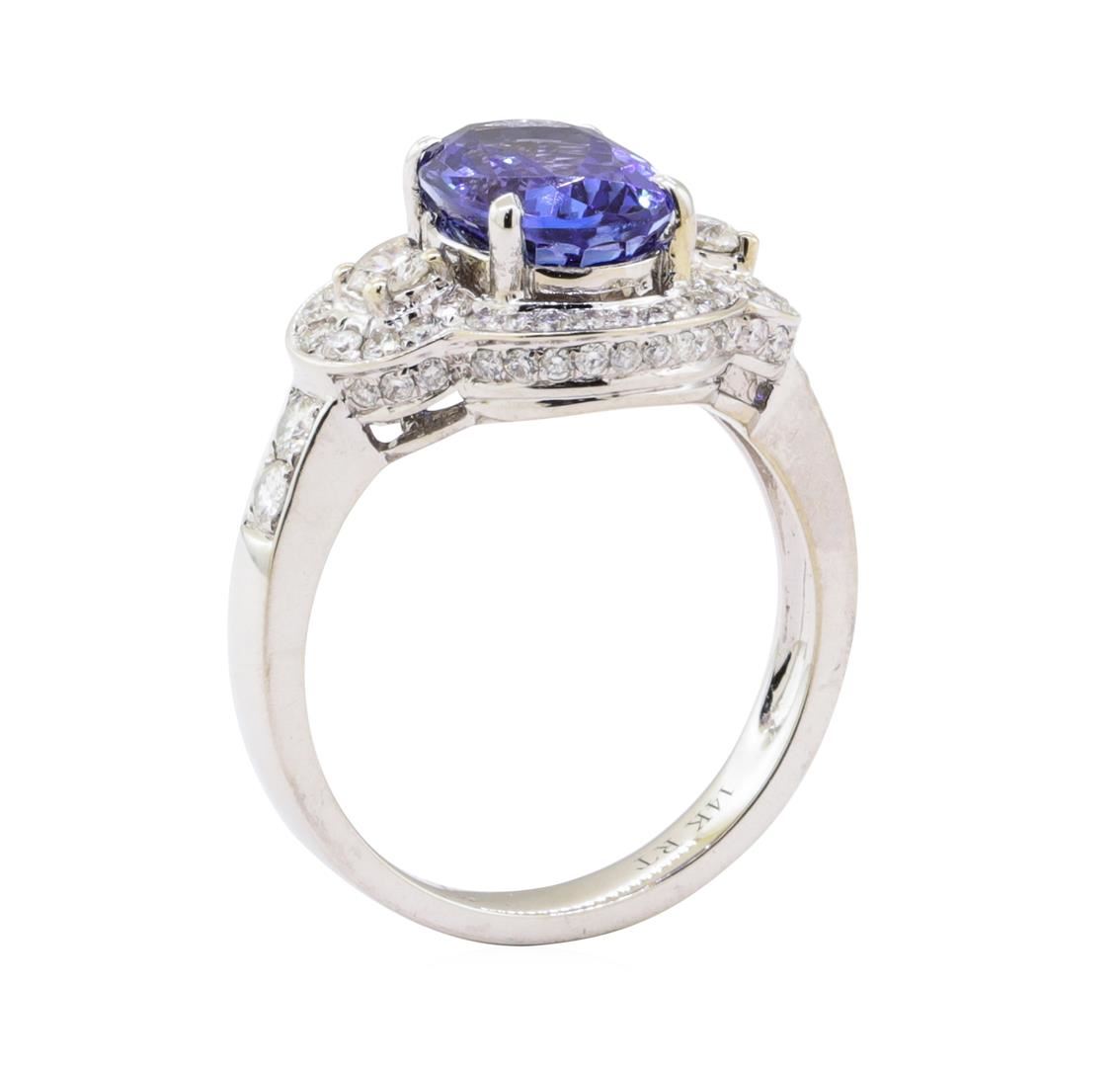 One electronically tested 14KT white gold ladies cast & assembled tanzanite & diamond ring. The featured tanzanite is set within a diamond bezel between mirroring diamond galleries, supported by a lattice under gallery and diamond set shoulders, completed by a three millimeter wide band. Bright polish ?nish. Identi?ed with markings of "l4K". Condition is new, good workmanship. Containing: One prong set oval modi?ed brilliant cut natural tanzanite, measuring 10.00 x 7.00 x 5.80mm, exact weight 2.88ct., clarity is eye clean, type I, medium dark, very slightly grayish, bluish violet color, (GIA bV 6/3), cut is good. Transmitting light with no distortion, transparent. Graded in the setting. Tanzanite is a very rare gemstone that is only found in the country of Tanzania. Originally discovered in 1967. Tiffany & Company, named the stone Tanzanite. It is found in the Usumburu Mountains that border the Umba Valley of northern Tanzania. Tanzanite occurs in gray, brown, violet, blue, reddish-purple, & green. The gem is interesting because of its exceptional pleochroism. Rotated in different directions a tanzanite will exhibit multiple changes of color. Tanzanite has a low tolerance to ultrasonic cleaning, and should not be cleaned using this method. Seventy-Two prong set round brilliant cut diamonds exact total weight 72 Stones = 0.7 4ct. Graded in the setting. Clarity SI-3 to I-2 Color F - H Total Weight of Colored Stones 2.88 ct. Total Weight of Diamonds 0.74 ct. Total Weight of Ring 5.30 gm Estimated Retail Value $ 9,190.00 US