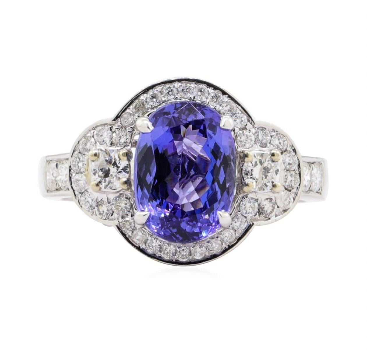 One electronically tested 14KT white gold ladies cast & assembled tanzanite & diamond ring. The featured tanzanite is set within a diamond bezel between mirroring diamond galleries, supported by a lattice under gallery and diamond set shoulders, completed by a three millimeter wide band. Bright polish ?nish. Identi?ed with markings of "l4K". Condition is new, good workmanship. Containing: One prong set oval modi?ed brilliant cut natural tanzanite, measuring 10.00 x 7.00 x 5.80mm, exact weight 2.88ct., clarity is eye clean, type I, medium dark, very slightly grayish, bluish violet color, (GIA bV 6/3), cut is good. Transmitting light with no distortion, transparent. Graded in the setting. Tanzanite is a very rare gemstone that is only found in the country of Tanzania. Originally discovered in 1967. Tiffany & Company, named the stone Tanzanite. It is found in the Usumburu Mountains that border the Umba Valley of northern Tanzania. Tanzanite occurs in gray, brown, violet, blue, reddish-purple, & green. The gem is interesting because of its exceptional pleochroism. Rotated in different directions a tanzanite will exhibit multiple changes of color. Tanzanite has a low tolerance to ultrasonic cleaning, and should not be cleaned using this method. Seventy-Two prong set round brilliant cut diamonds exact total weight 72 Stones = 0.7 4ct. Graded in the setting. Clarity SI-3 to I-2 Color F - H Total Weight of Colored Stones 2.88 ct. Total Weight of Diamonds 0.74 ct. Total Weight of Ring 5.30 gm Estimated Retail Value $ 9,190.00 US