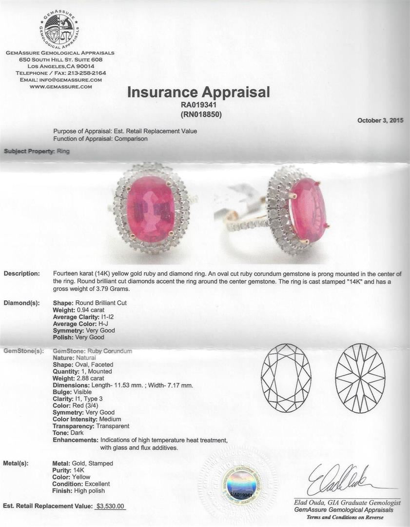 Fourteen karat (14K) yellow gold ruby and diamond ring. An oval cut ruby corundum gemstone is prong mounted in the center of the ring. Round brilliant cut diamonds accent the ring around the center gemstone. The ring is cast stamped "14K" and has a gross GGA Appraised.