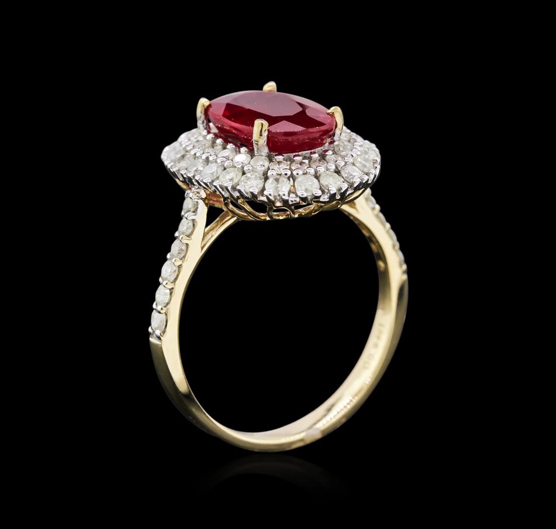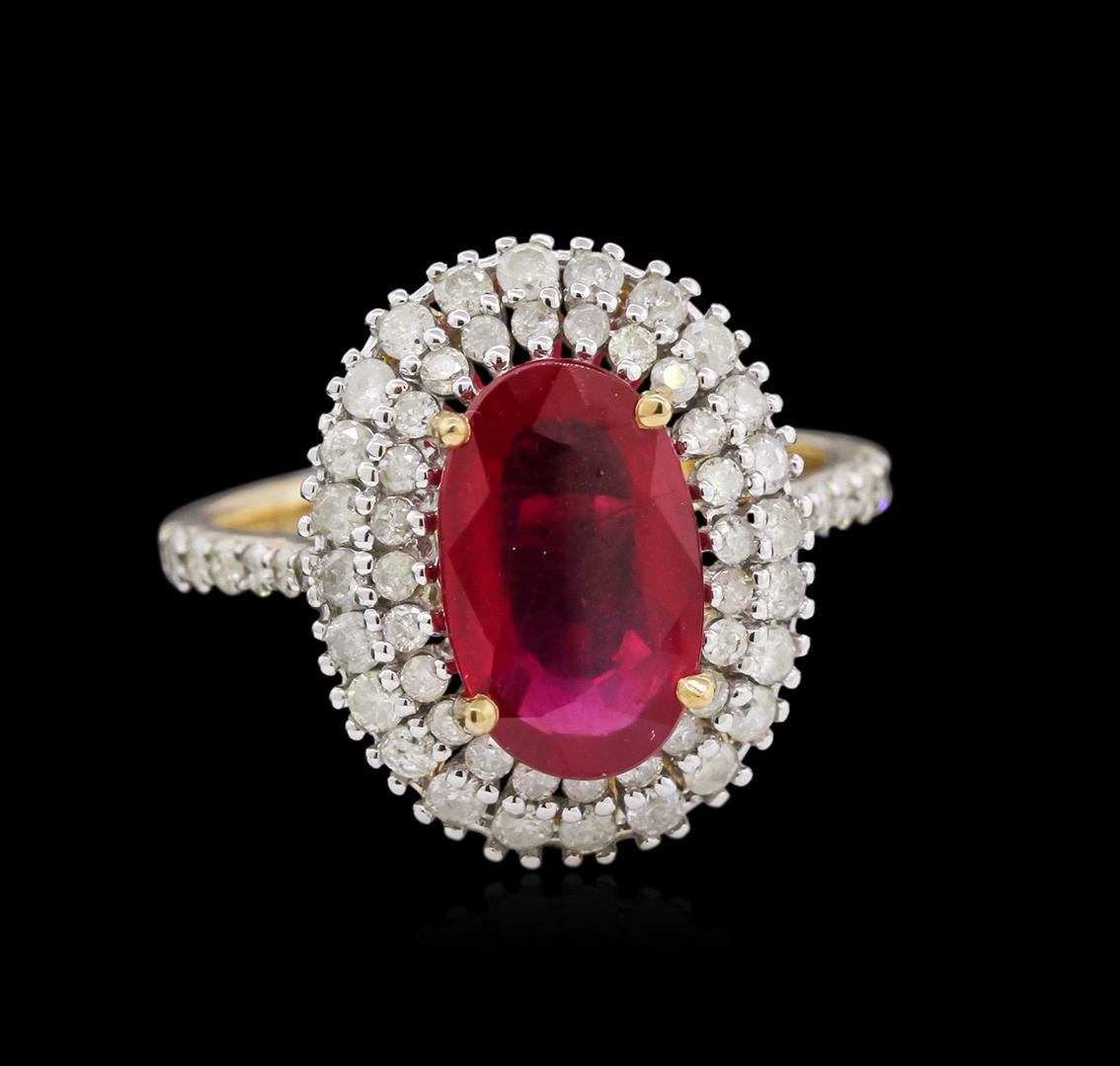 Fourteen karat (14K) yellow gold ruby and diamond ring. An oval cut ruby corundum gemstone is prong mounted in the center of the ring. Round brilliant cut diamonds accent the ring around the center gemstone. The ring is cast stamped "14K" and has a gross GGA Appraised.
