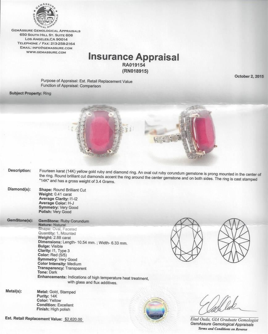 Fourteen karat (14K) yellow gold ruby and diamond ring. An oval cut ruby corundum gemstone is prong mounted in the center of the ring. Round brilliant cut diamonds accent the ring around the center gemstone. The ring is cast stamped "14K" and has a gross GGA Appraised.