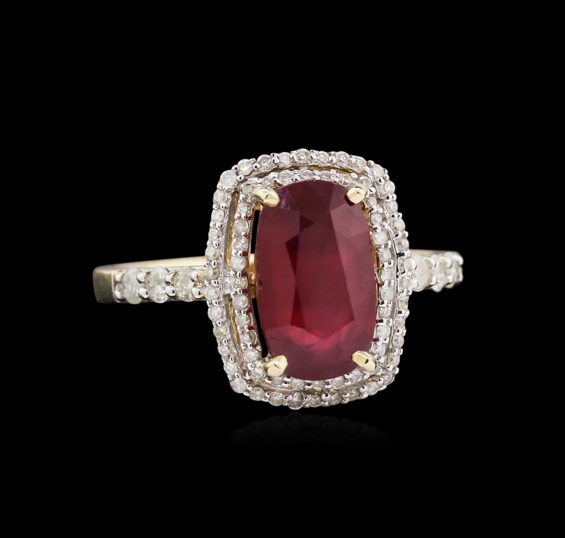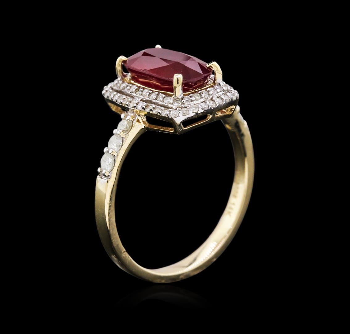 Fourteen karat (14K) yellow gold ruby and diamond ring. An oval cut ruby corundum gemstone is prong mounted in the center of the ring. Round brilliant cut diamonds accent the ring around the center gemstone. The ring is cast stamped "14K" and has a gross weight of 3.4 Grams. Diamond(s): Shape: Round Brilliant Cut. Weight: 0.41 carat. Average Clarity: I1-I2. Average Color: H-J. Symmetry: Very Good. Polish: Very Good. Gemstone(s): GemStone: Ruby Corundum. Nature: Natural. Shape: Oval, Faceted. Quantity: 1, Mounted. Weight 2.88 carat. Dimensions: Length-10.54mm. ; Width- 6.33 mm. Bulge: Visible. Clarity: I1, Type 3. Color: Red (5/5). Symmetry: Very Good. Color Intensity: Medium. Transparency: Transparent. Tone: Dark. Enhancements: Indications of high temperature heat treatment, with glass and flux additives. Metal(s): Metal: Gold, Stamped. Purity: 14K. Color: Yellow. Condition: Excellent. Finish: High polish. GGA Appraised.