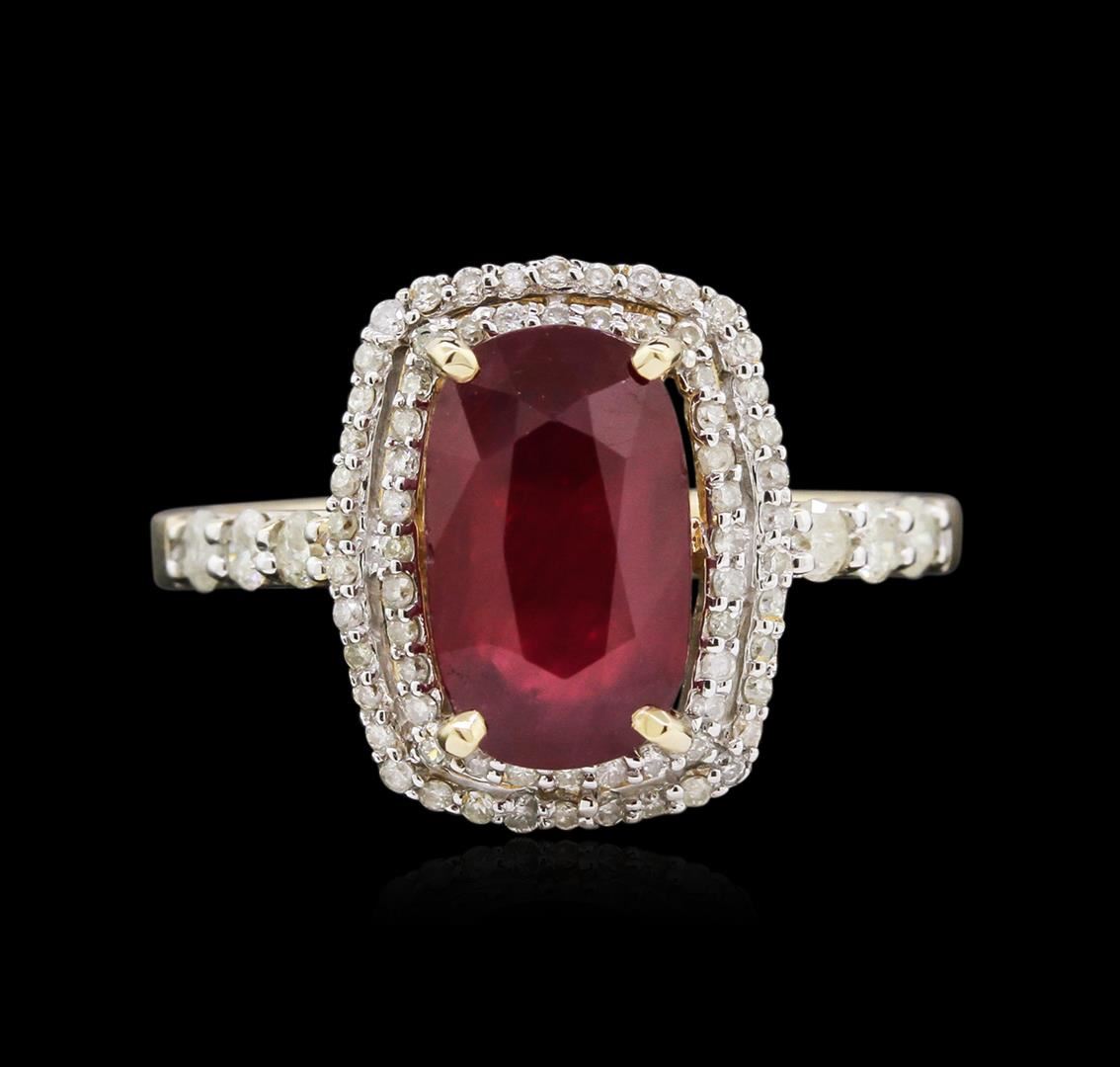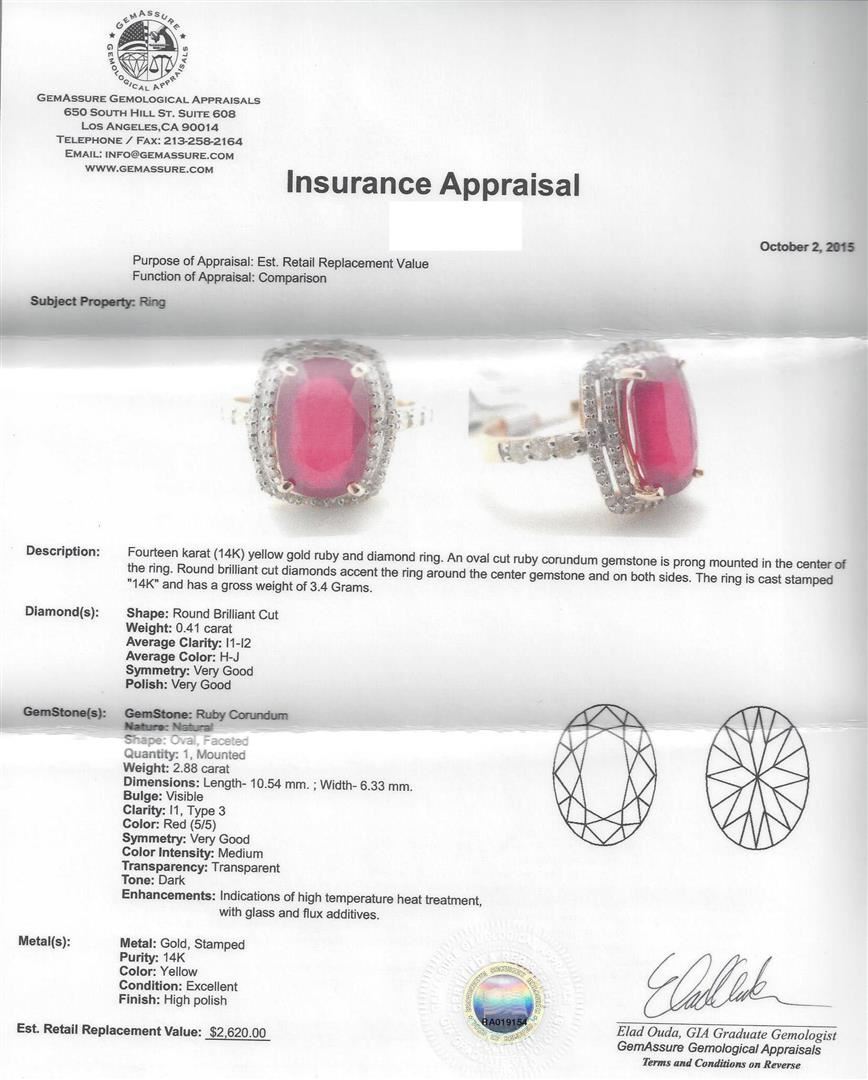 Fourteen karat (14K) yellow gold ruby and diamond ring. An oval cut ruby corundum gemstone is prong mounted in the center of the ring. Round brilliant cut diamonds accent the ring around the center gemstone. The ring is cast stamped "14K" and has a gross weight of 3.4 Grams. Diamond(s): Shape: Round Brilliant Cut. Weight: 0.41 carat. Average Clarity: I1-I2. Average Color: H-J. Symmetry: Very Good. Polish: Very Good. Gemstone(s): GemStone: Ruby Corundum. Nature: Natural. Shape: Oval, Faceted. Quantity: 1, Mounted. Weight 2.88 carat. Dimensions: Length-10.54mm. ; Width- 6.33 mm. Bulge: Visible. Clarity: I1, Type 3. Color: Red (5/5). Symmetry: Very Good. Color Intensity: Medium. Transparency: Transparent. Tone: Dark. Enhancements: Indications of high temperature heat treatment, with glass and flux additives. Metal(s): Metal: Gold, Stamped. Purity: 14K. Color: Yellow. Condition: Excellent. Finish: High polish. GGA Appraised.