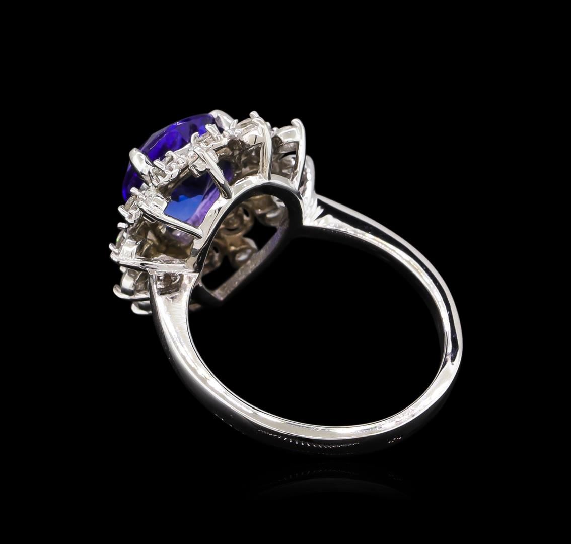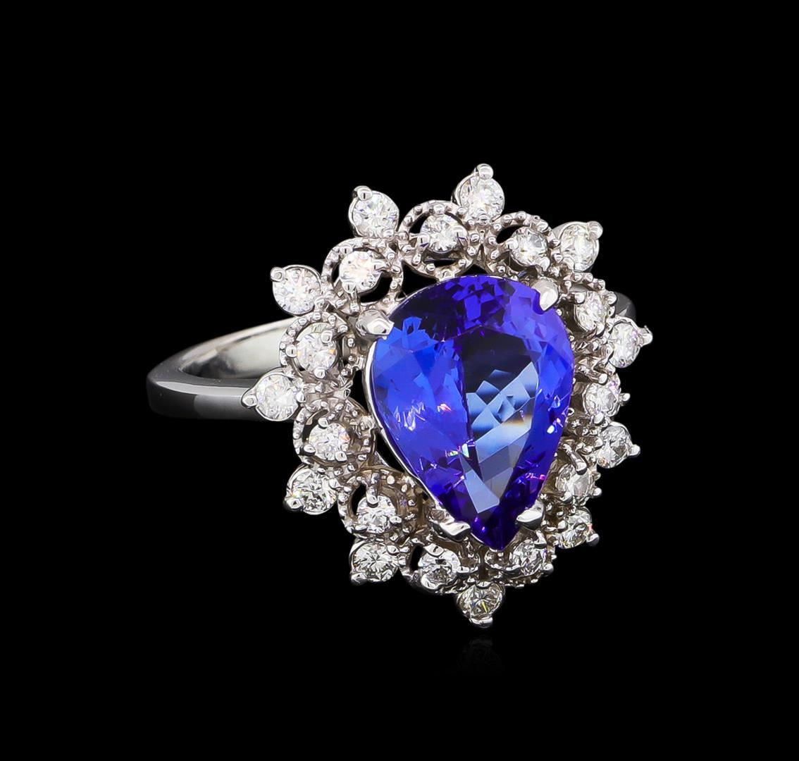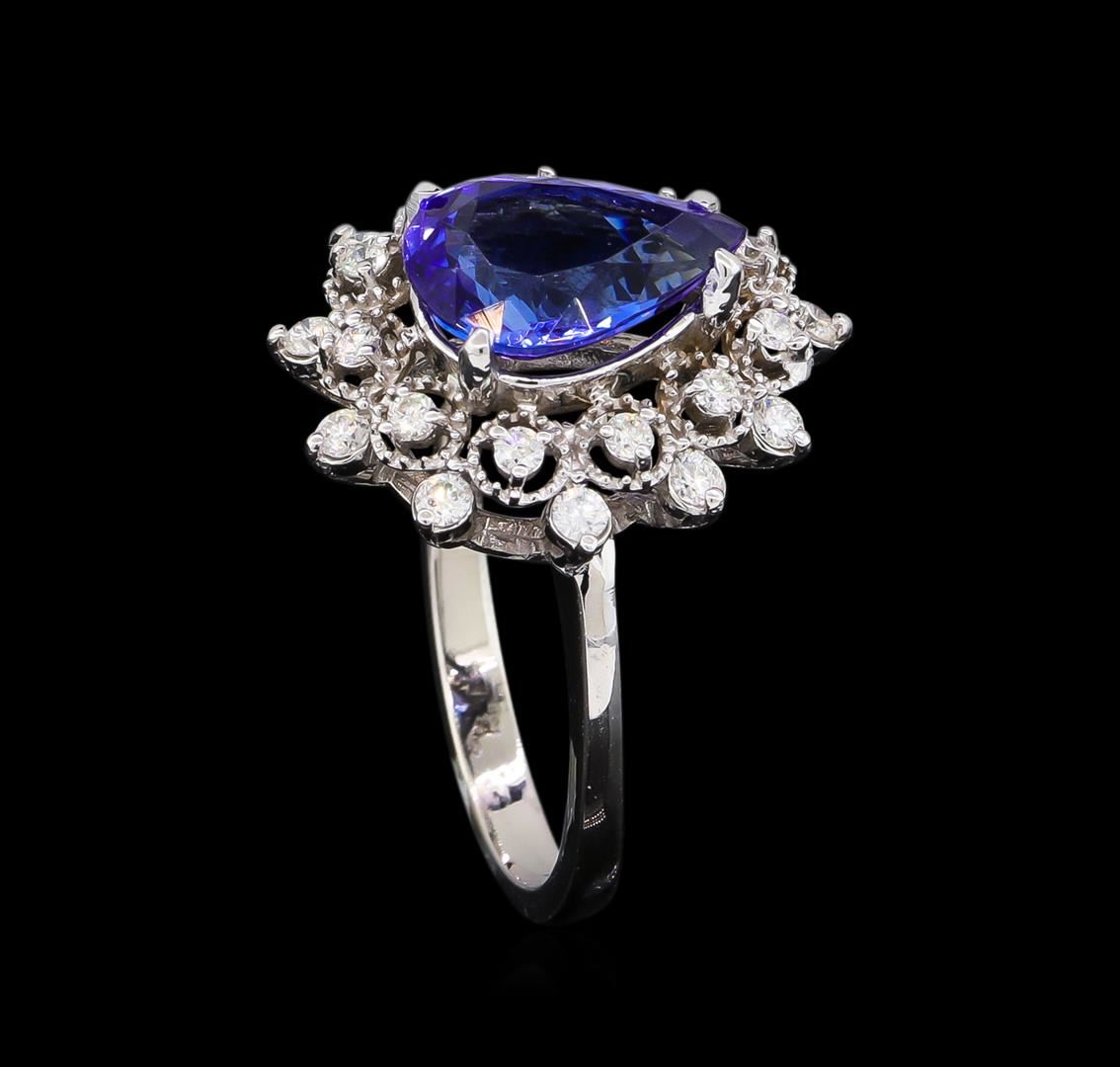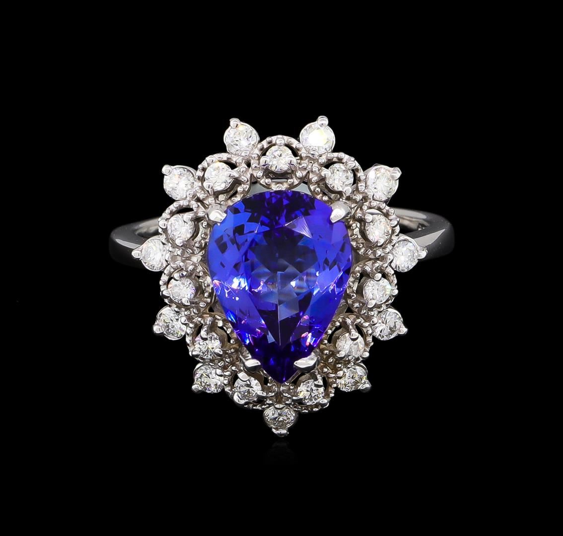 One electronically tested 14KT white gold lady's cast fashion ring with a basket double halo with a bright polish with milgrain detailing finish. The featured lady's ring has a shank measuring 2.39 millimeters wide. Identified with markings of "14K". Condition is new, good workmanship. Containing: One prong set pear modified brilliant cut natural tanzanite, measuring 11.24 x 8.33 x 4.80mm, approximate weight of 2.88ct., clarity is eye clean, type I, medium dark, moderately strong, violetish blue color, (GIA vB 6/4), cut is very good. Transmitting light with no distortion, transparent. Colored gemstones are presumed to have been subjected to commonly used enhancement processes. Graded in the setting. Eleven prong set round brilliant cut diamonds, measuring 1.90 - 1.80 x 1.13mm (depth est.) approximate total weight of 11 Stones = 0.26ct. Graded in the setting. Clarity: VS-2 to SI-2. Color: H - I. Cut Good Eleven prong set round brilliant cut diamonds, measuring 1.70 - 1.60 x 1.02mm (depth est.) approximate total weight of 11 Stones = 0.19ct. Graded in the setting. Clarity: VS-2 to SI-2. Color: H - I. Cut Good. Total Weight of Colored Stones 2.88ct. Total Weight of Diamonds 0.45ct. Total Weight of Ring 5.00gm. GAS Appraised at $6,380.00.