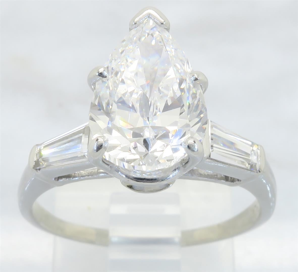 One tested platinum diamond ring. Containing: One Pear Cut Diamond. Approximate Size: 2.50CT, Clarity: SI1, Color: F-G. Two Baguette Cut Diamonds. Approximate total diamond weight: 2.89CTW. All diamonds are graded in the mounting unless otherwise stated. Weight of ring: 4.5 grams, Size: 7.0.