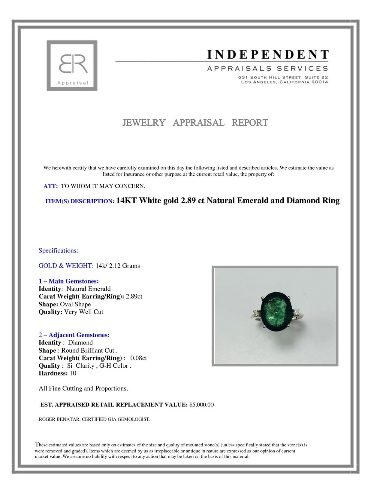 14KWHITE GOLD NATURAL COLOMBIAN EMERALD RING:2.12 GRAMS/COLOMBIAN EMERALD:2.89CT/ DIAMOND RD:0.08CT/#GVR1214 **This 2.89ct Oval Cut Natural Emerald catches the light and gleams like rolling hills of fresh green grass after rain. Of all gemstones, Emerald is the purest crystalline emanation of the Green Ray, color of the heart chakra. Warmly crafted in 14k white gold and flanked with a duo of 0.08ct round brilliant cut Diamonds, it inspires thoughts of timeless grace and beauty.**