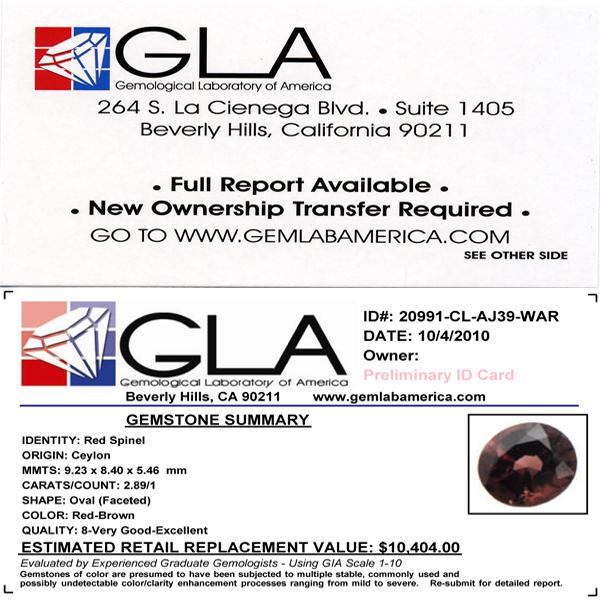 Excellent red brown colored specimen oval cut; lab quality evaluation 8; treatment as noted; Gem Guide wholesale $1734-$2890; full retail appraisal $10404; full lab evaluation available
