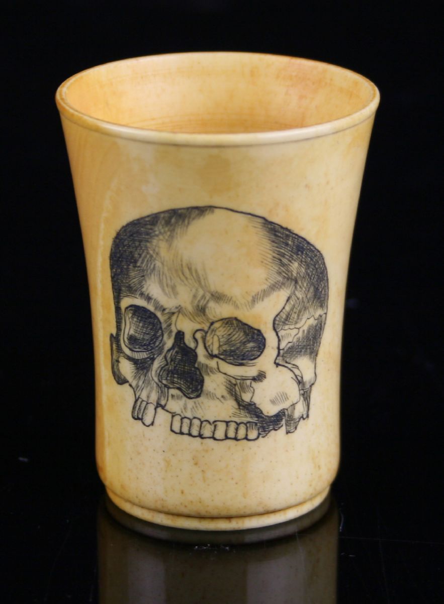 Nice drinking cup carved from bone with an engraved skull! Really cool. Exact age unknown.