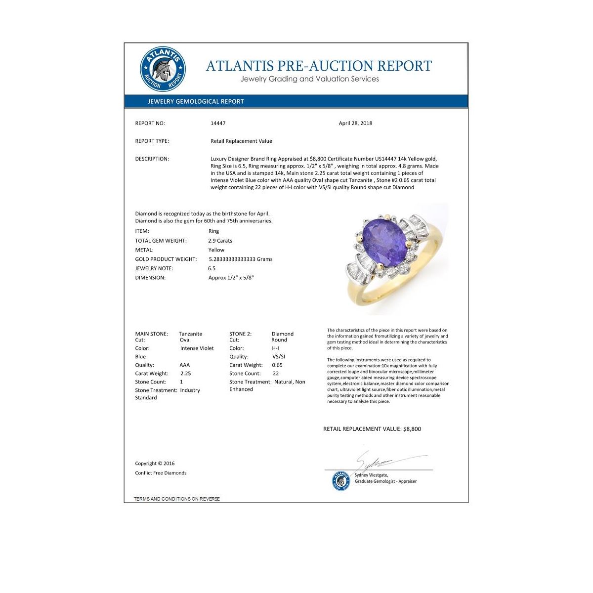 REF-114X5T -14447 ---- 2.90 CTW Tanzanite & Diamond Ring 14K Yellow Gold ---- Luxury Designer Brand Ring Appraised at $8,800 Certificate Number US14447 14k Yellow gold, Ring Size is 6.5, Ring measuring approx. 1/2" x 5/8" , weighing in total approx. 4.8 grams. Made in the USA and is stamped 14k, Main stone 2.25 carat total weight containing 1 pieces of Intense Violet Blue color with AAA quality Oval shape cut Tanzanite , Stone #2 0.65 carat total weight containing 22 pieces of H-I color with VS/SI quality Round shape cut Diamond