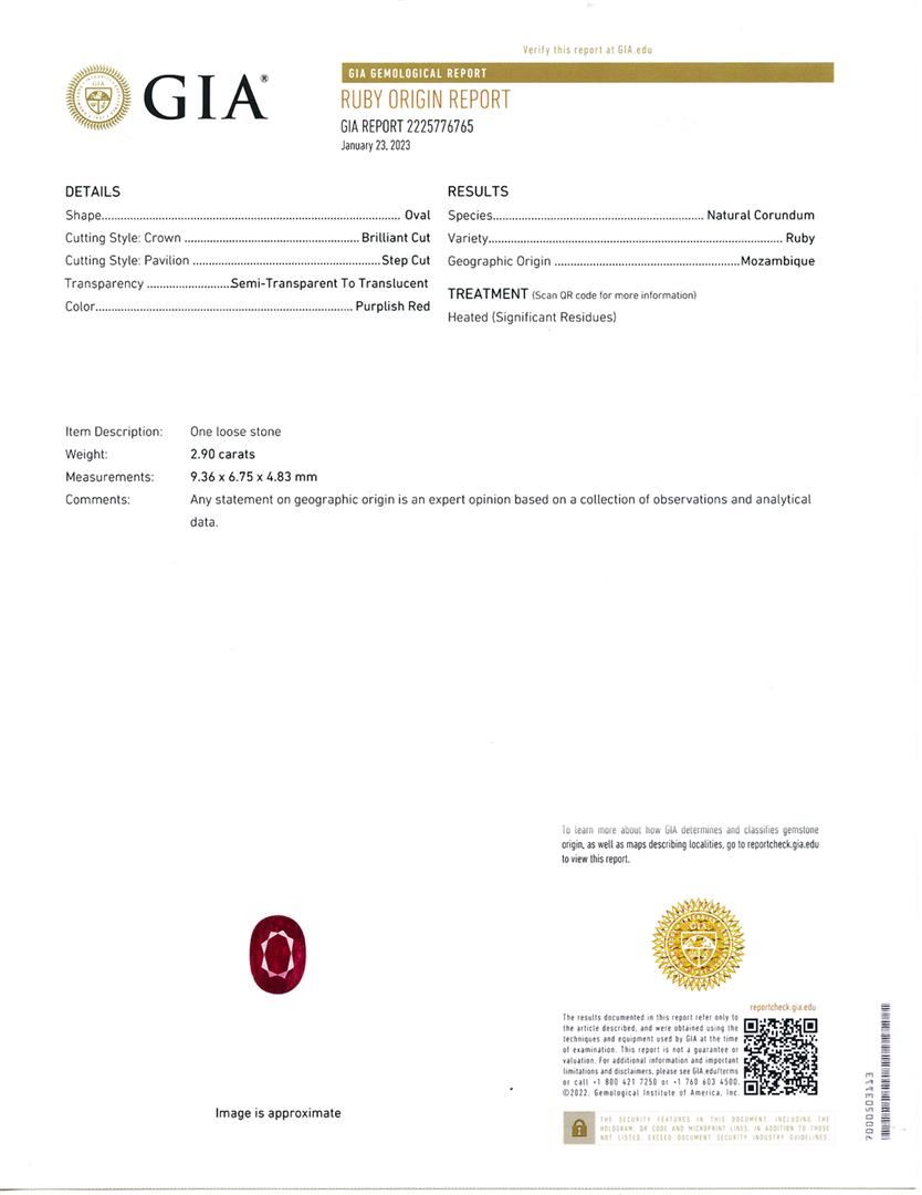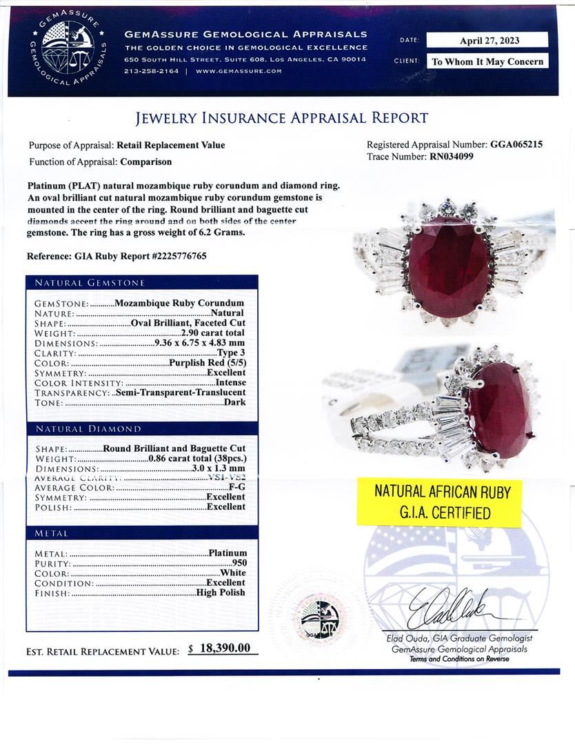 2.90ct AFRICAN Ruby and 0.86ctw Diamond Platinum Ring (GIA CERTIFIED). Platinum (PLAT) natural mozambique ruby corundum and diamond ring. An oval brilliant cut natural mozambique ruby corundum gemstone is mounted in the center of the ring. Round brilliant and baguette cut diamonds accent the ring around and on both sides of the center gemstone. The ring has a gross weight of 6.2 Grams. Reference: GIA Ruby Report 2225776765 NATURAL GEMSTONE GEMSTONE: Mozambique Ruby Corundum NATURE: Natural SHAPE: Oval Brilliant, Faceted Cut WEIGHT: 2.90 carat total DIMENSIONS: 9.36 x 6.75 x 4.83mm CLARITY: Type 3 COLOR: Purplish Red (5/5) SYMMETRY: Excellent COLOR INTENSITY: Intense TRANSPARENCY: Semi-Transparent-Translucent TONE: Dark NATURAL DIAMOND SHAPE: Round Brilliant and Baguette Cut WEIGHT: 0.86 carat total (38pcs.) DIMENSIONS: 3.0 x 1.3mm AVERAGE CLARITY: VS1-VS2 AVERAGE COLOR: F-G SYMMETRY: Excellent POLISH: Excellent METAL METAL: Platinum PURITY: 950 COLOR: White CONDITION: Excellent FINISH: High Polish
