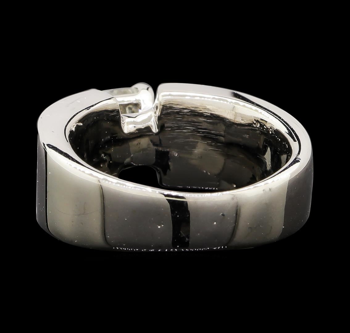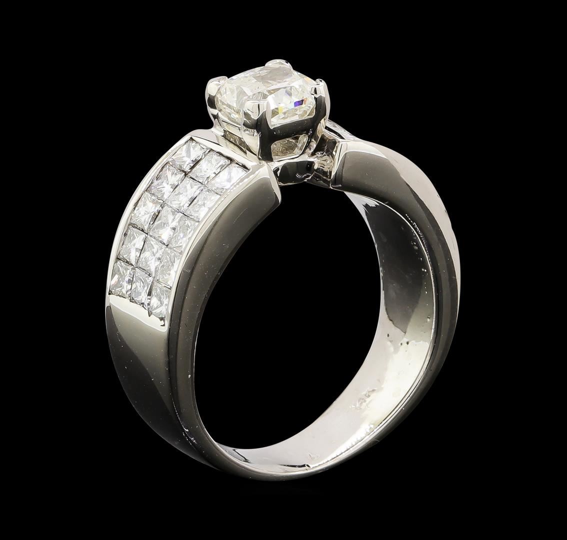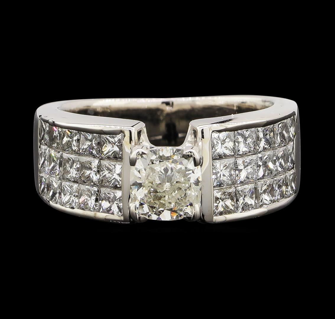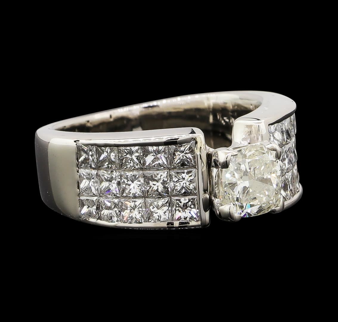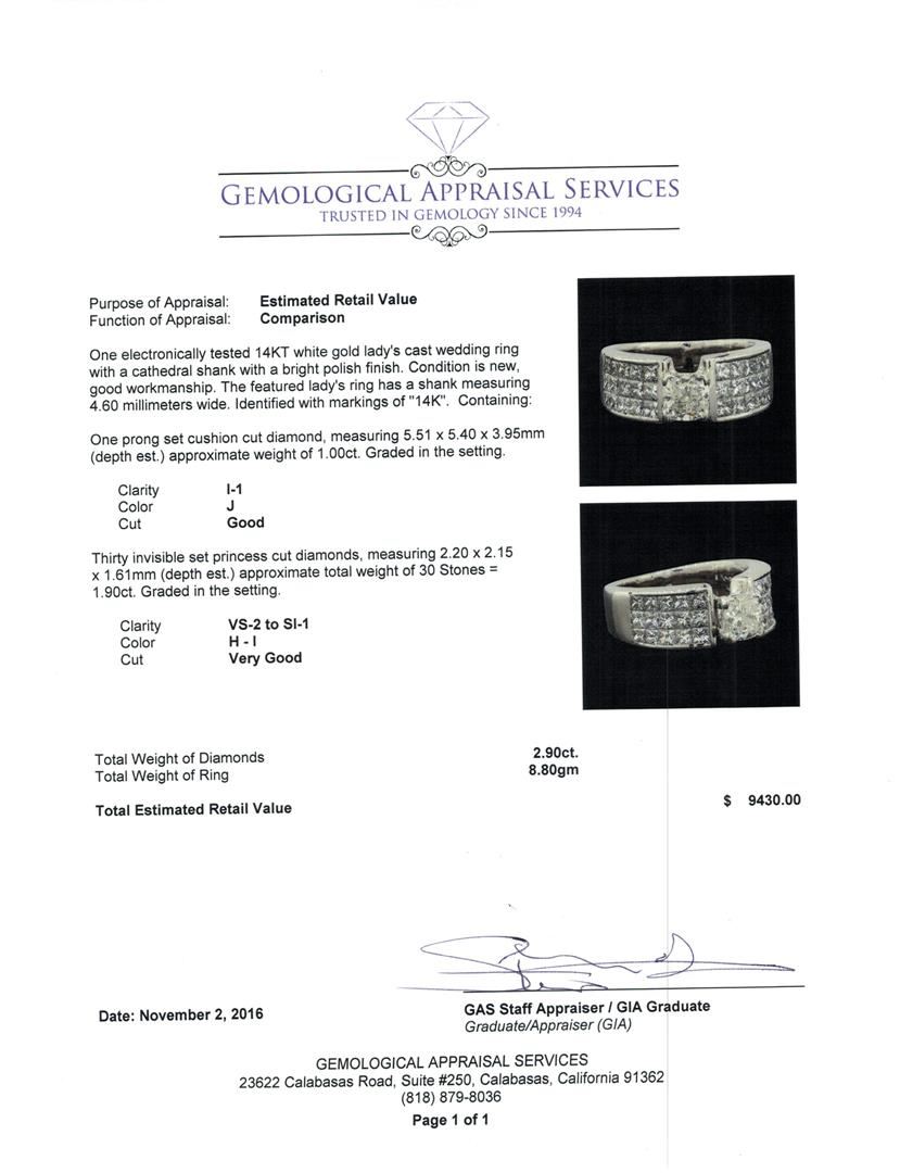 One electronically tested 14KT white gold lady's cast wedding ring with a cathedral shank with a bright polish finish. The featured lady's ring has a shank measuring 4.60 millimeters wide. Identified with markings of '14K'. Condition is new, good workmanship. Containing: One prong set cushion cut diamond, measuring 5.51 x 5.40 x 3.95mm (depth est.) approximate weight of 1.00ct. Graded in the setting. Clarity I-1. Color: J Cut Good Thirty invisible set princess cut diamonds, measuring 2.20 x 2.15 x 1.61mm (depth est.) approximate total weight of 30 Stones = 1.90ct. Graded in the setting. Clarity VS-2 to SI-1. Color: H - I Cut Very Good. Total Weight of Diamonds 2.90ct.. Total Weight of Ring 8.80gm. GAS Appraised at $9,430.00.