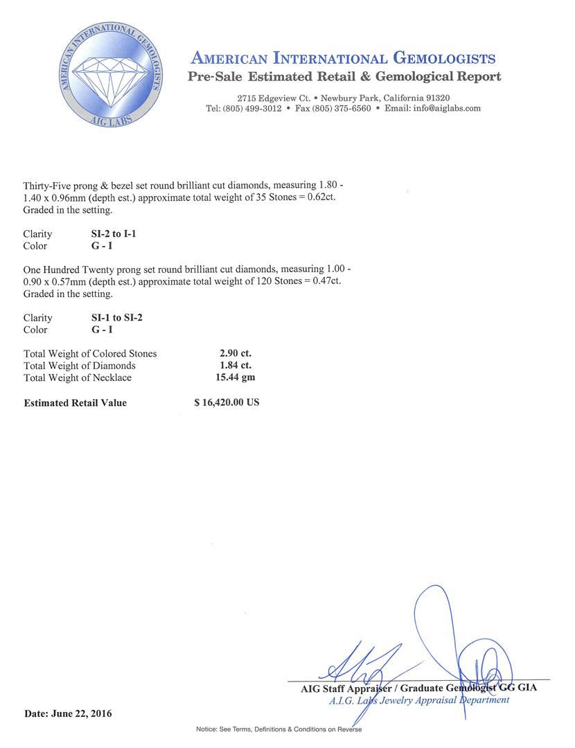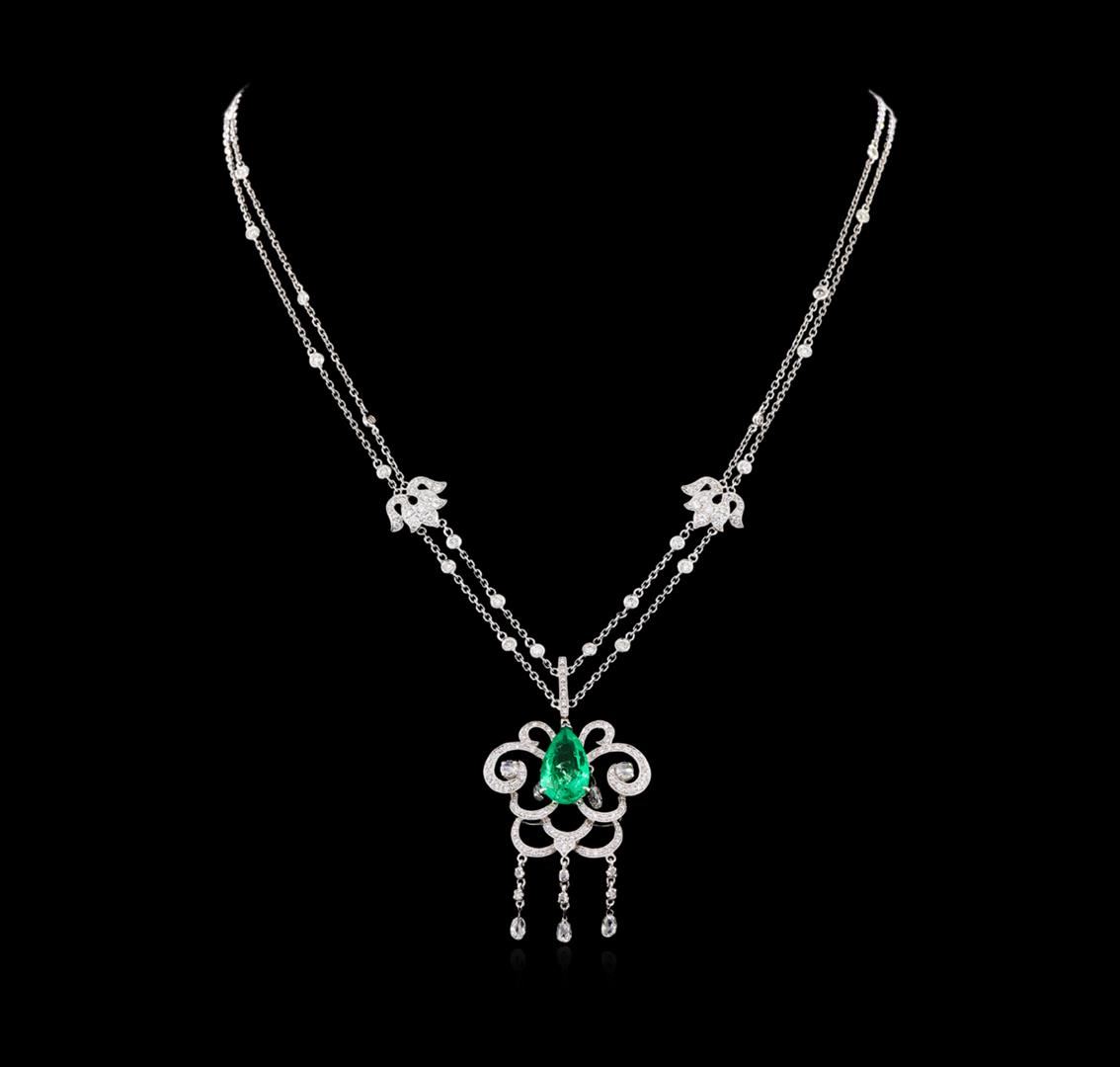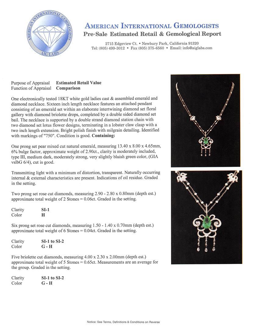 One electronically tested 18KT white gold ladies cast & assembled emerald and diamond necklace. Sixteen inch length necklace features an attached pendant consisting of an emerald set within an elaborate intertwining diamond set floral gallery with diamond briolette drops, completed by a double sided diamond set bail. The necklace is supported by a double strand diamond station chain with two diamond set lotus flower designs, terminating in a lobster claw clasp with a two inch length extension. Bright polish finish with milgrain detailing. Identified with markings of "750". Condition is good. Containing: One prong set pear mixed cut natural emerald, measuring 13.40 x 8.00. x 4.65mm, 6%. bulge factor, approximate weight of 2.90ct., clarity is moderately included, type III, medium dark, moderately strong, very slightly bluish green color, (GIA vslbG 6/4), cut is good. Transmitting light with a minimum of distortion, transparent. Naturally occurring internal & external characteristics are present. Indications of oil residue. Graded in the setting. Two prong set rose cut diamonds, measuring 2.90 - 2.80 x 0.80mm (depth est.) approximate total weight of 2 Stones = 0.06ct. Graded in the setting. Clarity: SI-1 . Color: H Six prong set rose cut diamonds, measuring 1.50 - 1.40 x 0.70mm (depth est.) approximate total weight of 6 Stones = 0.04ct. Graded in the setting. Clarity: SI-1 to SI-2 . Color: G - H Five briolette cut diamonds, measuring 4.00. x 2.30 x 2.00.mm (depth est.) approximate total weight of 5 Stones = 0.65ct. Measurements are an average for the group. Graded in the setting. Clarity: SI-1 to SI-2 . Color: G - H Thirty-Five prong & bezel set round brilliant cut diamonds, measuring 1.80 - 1.40 x 0.96mm (depth est.) approximate total weight of 35 Stones = 0.62ct. Graded in the setting. Clarity: SI-2 to I-1 . Color: G - I One Hundred Twenty prong set round brilliant cut diamonds, measuring 1.00. - 0.90 x 0.57mm (depth est.) approximate total weight of 120 Stones = 0.47ct. Graded in the setting. Clarity: SI-1 to SI-2 . Color: G - I. Total Weight of Colored Stones 2.90ct.. Total Weight of Diamonds 1.84ct.. Total Weight of Necklace 15.44gm. AIG Appraised at $16,420.00.