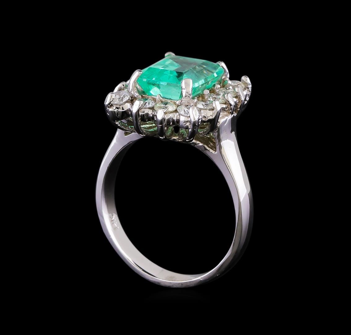 One electronically tested 14KT white gold lady's cast fashion ring with a cathedral basket halo with a bright polish finish. The featured lady's has a shank measuring 3.18 millimeters in width. Identified with markings of "14K". Condition is new, good workmanship. Containing: One prong set emerald step cut natural emerald, measuring 9.65 x 8.03 x 5.24mm, (depth est.) approximate weight of 2.90ct., clarity is slightly included, medium, moderately strong, green color, (GIA G 5/4), cut is very good. Transmitting light with a minimum of distortion, transparent. Indications of oil residue. Naturally occurring internal & external characteristics are present. Colored gemstones are presumed to have been subjected to commonly used enhancement processes. Graded in the setting. Fourteen prong set round brilliant cut diamonds, measuring 2.60 - 2.50 x 1.57mm (depth est.) approximate total weight of 14 Stones = 0.88ct. Graded in the setting. Clarity: VS-2 to SI-2. Color: H - I. Cut Good. Total Weight of Colored Stones 2.90ct. Total Weight of Diamonds 0.88ct. Total Weight of Ring 6.50gm. GAS Appraised.