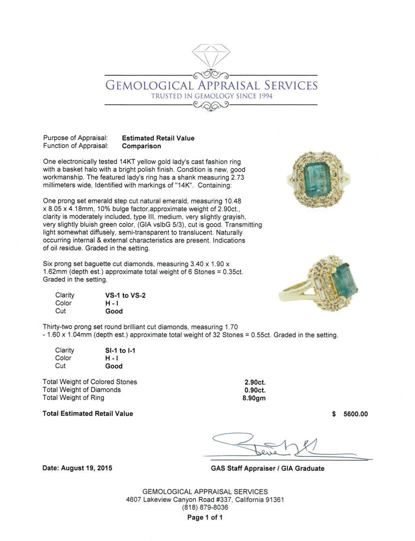 One electronically tested 14KT yellow gold lady's cast fashion ring with a basket halo with a bright polish finish. The featured lady's ring has a shank measuring 2.73 millimeters wide, Identified with markings of "14K". Condition is new, good workmanship. Containing: One prong set emerald step cut natural emerald, measuring 10.48 x 8.05 x 4.18mm, 10% bulge factor, approximate weight of 2.90ct., clarity is moderately included, type III, medium, very slightly grayish, very slightly bluish green color, (GIA vslbG 5/3), cut is good. Transmitting light somewhat diffusely, semi-transparent to translucent. Naturally occurring internal & external characteristics are present. Indications of oil residue. Graded in the setting. Six prong set baguette cut diamonds, measuring 3.40 x 1.90 x 1.62mm (depth est.) approximate total weight of 6 Stones = 0.35ct. Graded in the setting. Clarity: VS-1 to VS-2. Color: H - I. Cut Good Thirty-Two prong set round brilliant cut diamonds, measuring 1.70 - 1.60 x 1.04mm (depth est.) approximate total weight of 32 Stones = 0.55ct. Graded in the setting. Clarity: SI-1 to I-1. Color: H - I. Cut Good. Total Weight of Colored Stones 2.90ct. Total Weight of Diamonds 0.90ct. Total Weight of Ring 8.90gm. GAS Appraised at $5,600.00.
