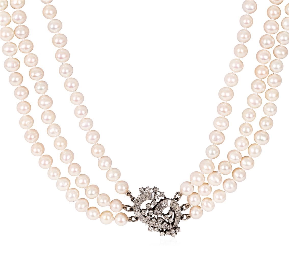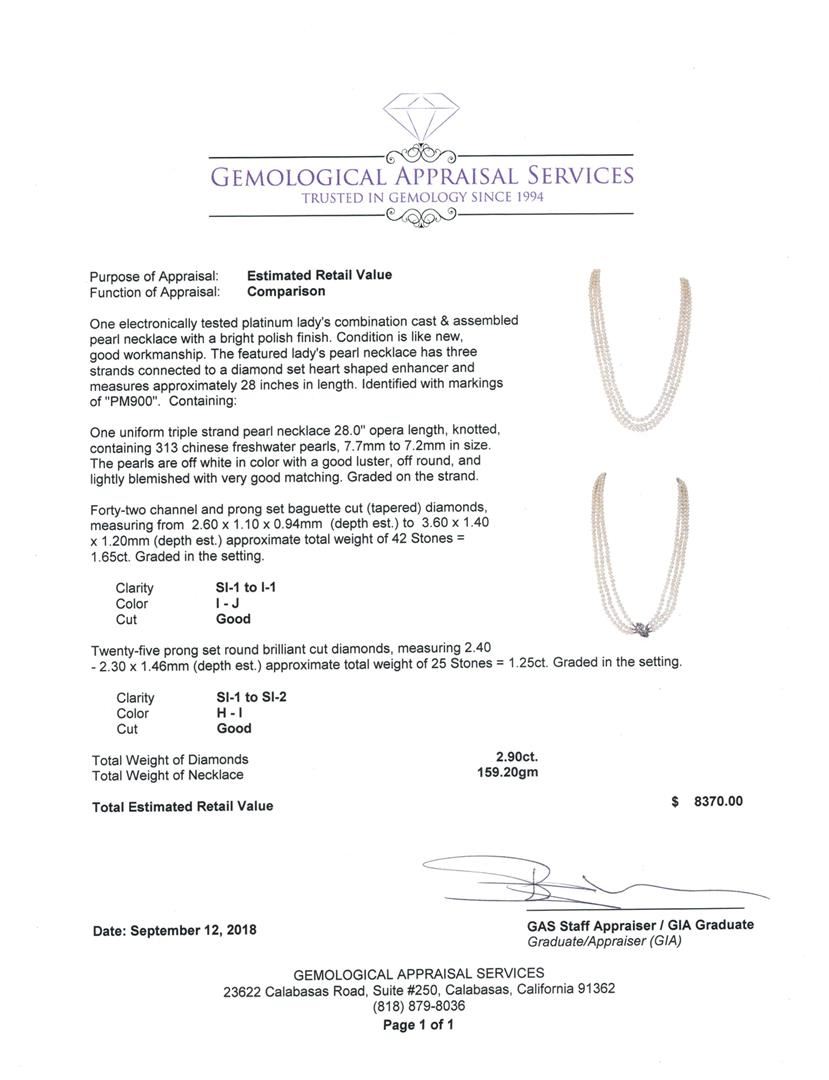 One electronically tested platinum lady's combination cast & assembled pearl necklace with a bright polish finish. The featured lady's pearl necklace has three strands connected to a diamond set heart shaped enhancer and measures approximately 28 inches in length. Identified with markings of 'PM900'. Condition is like new, good workmanship. Containing: One uniform triple strand pearl necklace 28.0' opera length, knotted, containing 313 chinese freshwater pearls, 7.7mm to 7.2mm in size. The pearls are off white in color with a good luster, off round, and lightly blemished with very good matching. Graded on the strand. Forty-Two channel and prong set baguette cut (tapered) diamonds, measuring from 2.60 x 1.10 x 0.94mm (depth est.) to 3.60 x 1.40 x 1.20mm (depth est.) approximate total weight of 42 Stones = 1.65ct. Graded in the setting. Color I - J Clarity SI-1 to I-1 Cut Good Twenty-Five prong set round brilliant cut diamonds, measuring 2.40 - 2.30 x 1.46mm (depth est.) approximate total weight of 25 Stones = 1.25ct. Graded in the setting. Color H - I Clarity SI-1 to SI-2 Cut Good. Total Weight of Diamonds 2.90ct.. Total Weight of Necklace 159.20gm GAS Appraised at $8370.00. GAS Appraised at $8,370.00.