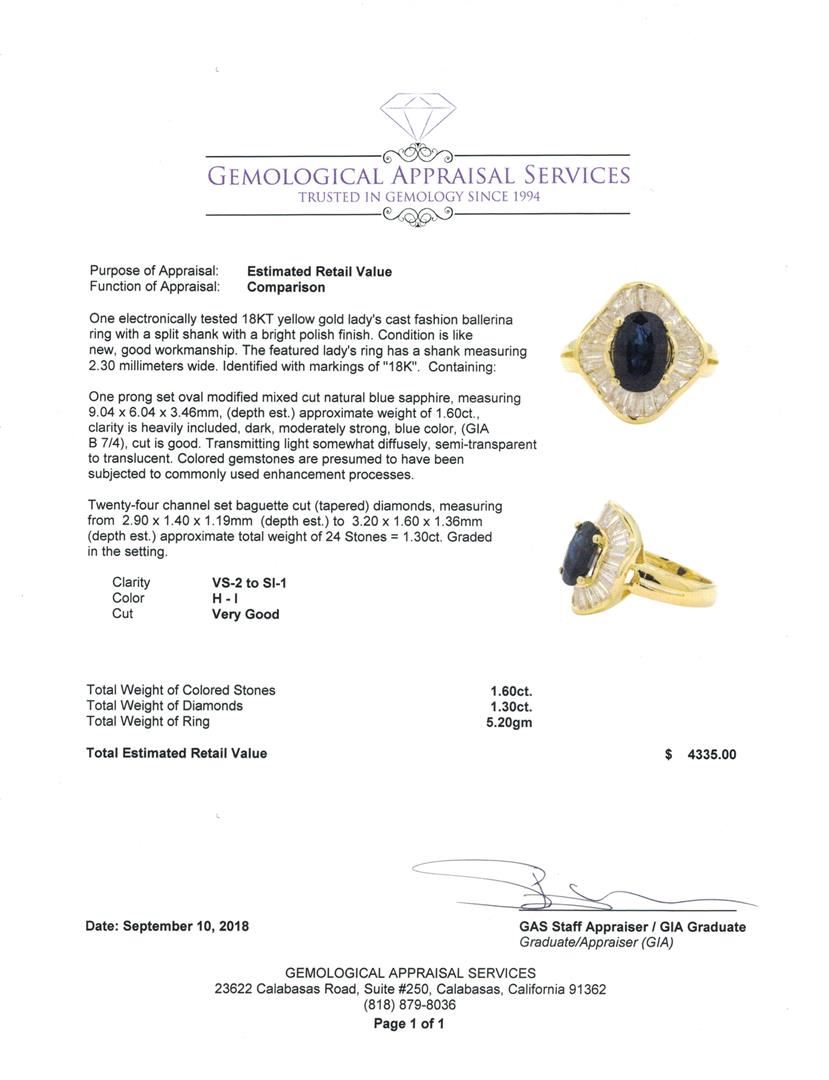 One electronically tested 18KT yellow gold lady's cast fashion ballerina ring with a split shank with a bright polish finish. The featured lady's ring has a shank measuring 2.30 millimeters wide. Identified with markings of '18K'. Condition is like new, good workmanship. Containing: One prong set oval modified mixed cut natural blue sapphire, measuring 9.04 x 6.04 x 3.46mm, (depth est.) approximate weight of 1.60ct., clarity is heavily included, dark, moderately strong, blue color, (GIA B 7/4), cut is good. Transmitting light somewhat diffusely, semi-transparent to translucent. Colored gemstones are presumed to have been subjected to commonly used enhancement processes. Twenty-Four channel set baguette cut (tapered) diamonds, measuring from 2.90 x 1.40 x 1.19mm (depth est.) to 3.20 x 1.60 x 1.36mm (depth est.) approximate total weight of 24 Stones = 1.30ct. Graded in the setting. Color H - I Clarity VS-2 to SI-1 Cut Very Good. Total Weight of Colored Stones 1.60ct.. Total Weight of Diamonds 1.30ct.. Total Weight of Ring 5.20gm GAS Appraised at $4335.00. GAS Appraised at $4,335.00.