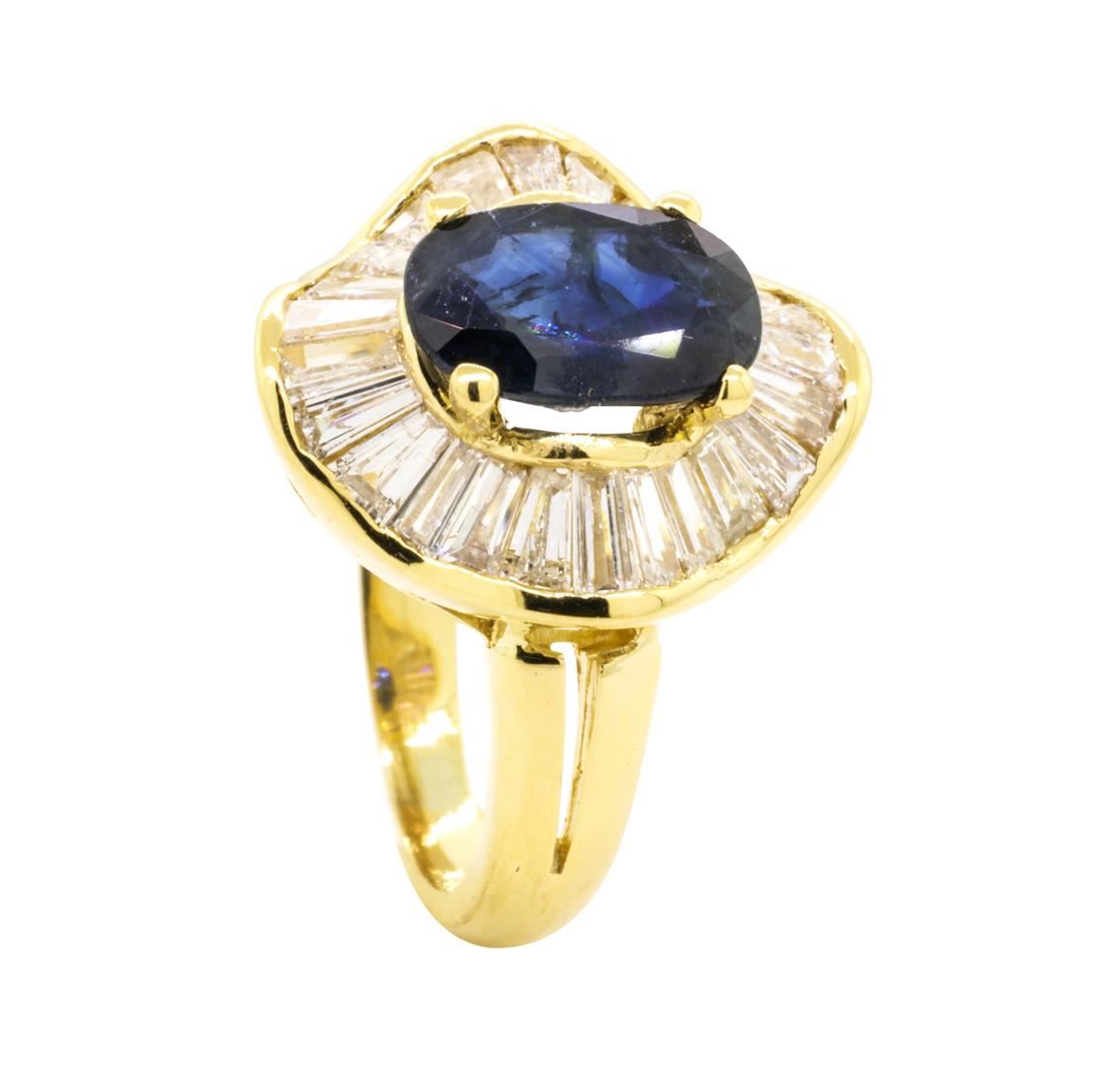 One electronically tested 18KT yellow gold lady's cast fashion ballerina ring with a split shank with a bright polish finish. The featured lady's ring has a shank measuring 2.30 millimeters wide. Identified with markings of '18K'. Condition is like new, good workmanship. Containing: One prong set oval modified mixed cut natural blue sapphire, measuring 9.04 x 6.04 x 3.46mm, (depth est.) approximate weight of 1.60 ct., clarity is heavily included, dark, moderately strong, blue color, (GIA B 7/4), cut is good. Transmitting light somewhat diffusely, semi-transparent to translucent. Colored gemstones are presumed to have been subjected to commonly used enhancement processes. Twenty-Four channel set baguette cut (tapered) diamonds, measuring from 2.90 x 1.40 x 1.19mm (depth est.) to 3.20 x 1.60 x 1.36mm (depth est.) approximate total weight of 24 Stones = 1.30 ct. Graded in the setting. Color H - I Clarity VS-2 to SI-1 Cut Very Good. Total Weight of Colored Stones 1.60 ct.. Total Weight of Diamonds 1.30 ct.. Total Weight of Ring 5.20gm GAS Appraised at $4335.00. GAS Appraised.