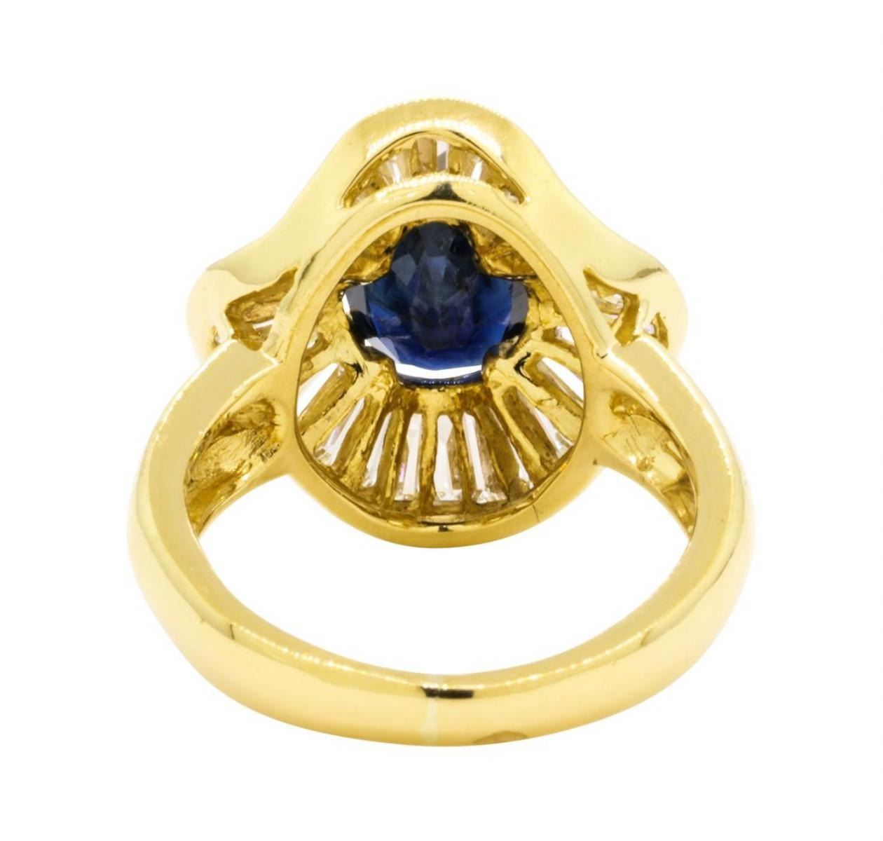 One electronically tested 18KT yellow gold lady's cast fashion ballerina ring with a split shank with a bright polish finish. The featured lady's ring has a shank measuring 2.30 millimeters wide. Identified with markings of '18K'. Condition is like new, good workmanship. Containing: One prong set oval modified mixed cut natural blue sapphire, measuring 9.04 x 6.04 x 3.46mm, (depth est.) approximate weight of 1.60 ct., clarity is heavily included, dark, moderately strong, blue color, (GIA B 7/4), cut is good. Transmitting light somewhat diffusely, semi-transparent to translucent. Colored gemstones are presumed to have been subjected to commonly used enhancement processes. Twenty-Four channel set baguette cut (tapered) diamonds, measuring from 2.90 x 1.40 x 1.19mm (depth est.) to 3.20 x 1.60 x 1.36mm (depth est.) approximate total weight of 24 Stones = 1.30 ct. Graded in the setting. Color H - I Clarity VS-2 to SI-1 Cut Very Good. Total Weight of Colored Stones 1.60 ct.. Total Weight of Diamonds 1.30 ct.. Total Weight of Ring 5.20gm GAS Appraised at $4335.00. GAS Appraised.