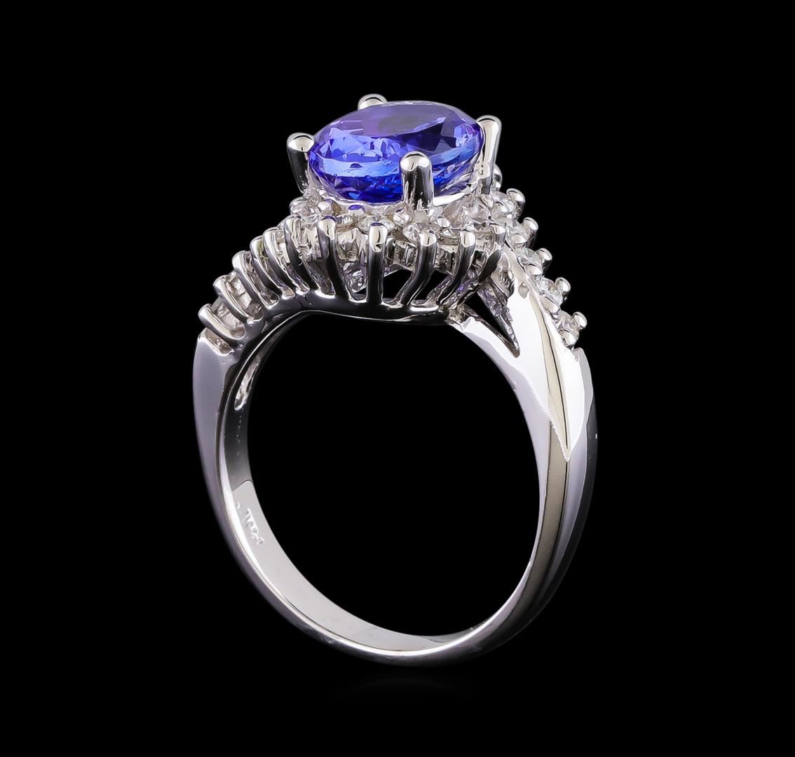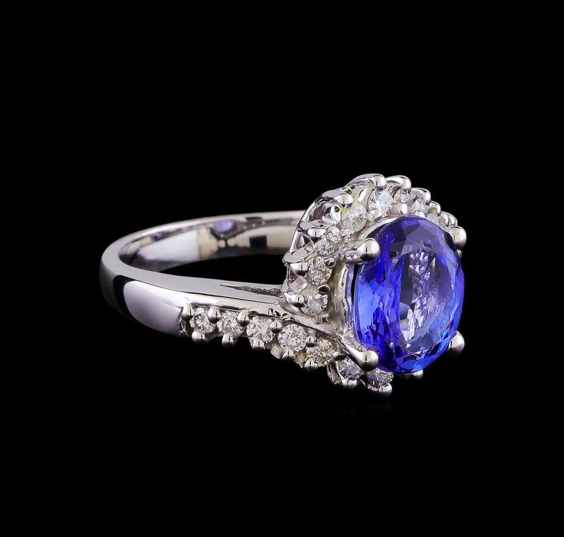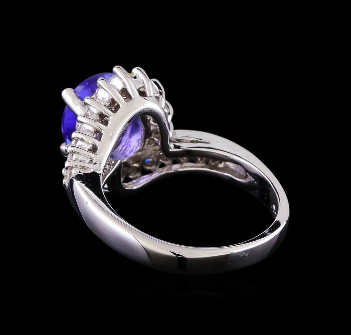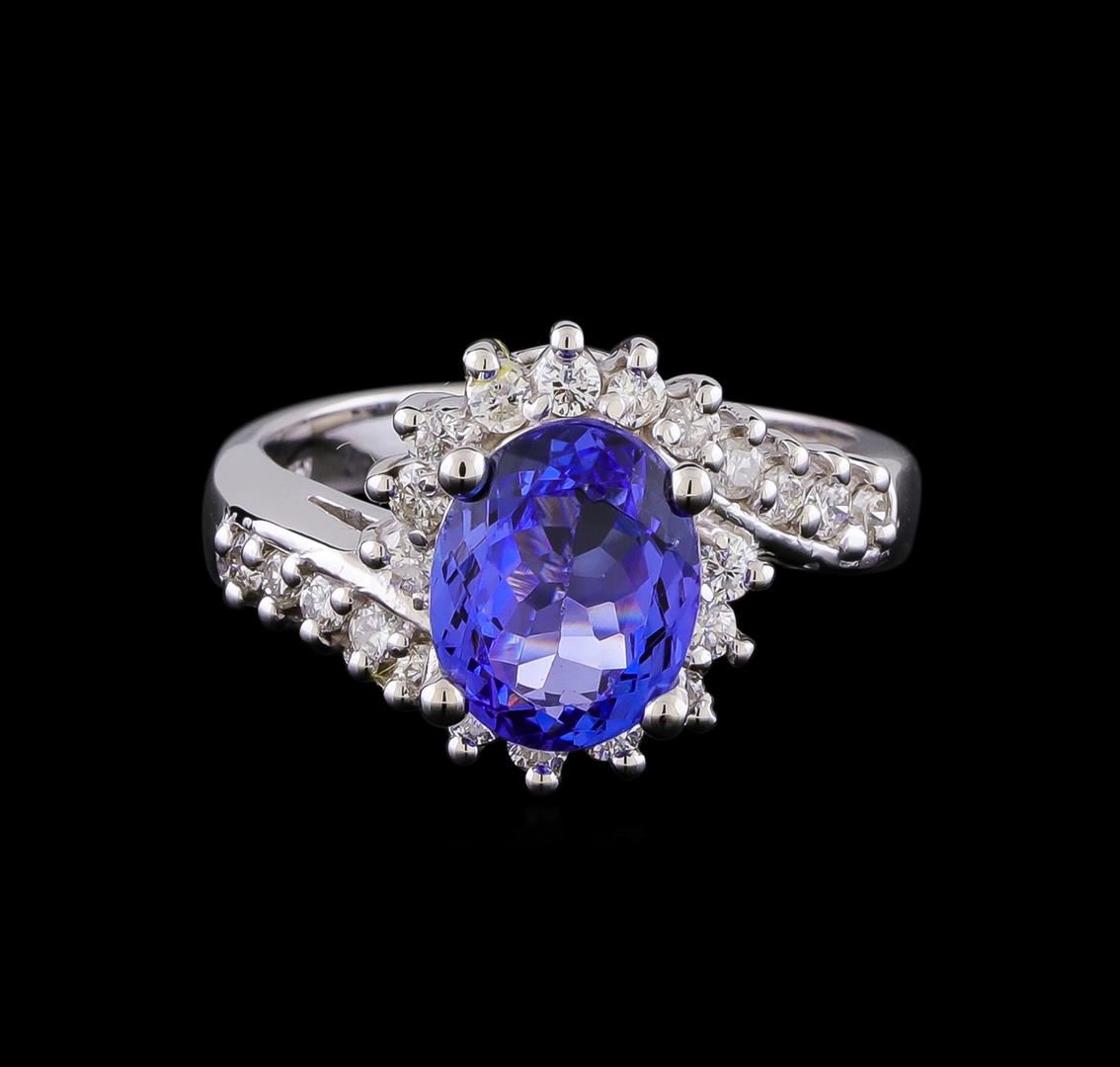 One electronically tested 14KT white gold lady's cast fashion ring with a basket bypass with a bright polish finish. The featured lady's has a shank measuring 2.95 millimeters in width. Identified with markings of "14K". Condition is new, good workmanship. Containing: One prong set oval modified brilliant cut natural tanzanite, measuring 9.95 x 7.85 x 4.73mm, (depth est.) 5%. bulge factor, approximate weight of 2.90ct., clarity is eye clean, medium light, moderately strong, bluish violet color, (GIA bV 4/4), cut is very good. Transmitting light with no distortion, transparent. Colored gemstones are presumed to have been subjected to commonly used enhancement processes. Graded in the setting. Twenty-Two prong set round brilliant cut diamonds, measuring 1.90 - 1.85 x 1.17mm (depth est.) approximate total weight of 22 Stones = 0.55ct. Graded in the setting. Clarity: SI-1 to I-1. Color: G - Good. Total Weight of Colored Stones 2.90ct. Total Weight of Diamonds 0.55ct. Total Weight of Ring 7.30gm. GAS Appraised.