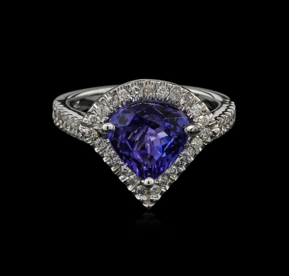 One electronically tested 14KT white gold lady's cast halo ring with a cathedral shank with a bright polish finish. The featured ring has a 2.4mm shank Identified with markings of "14K". Condition is new, good workmanship. Containing: One prong set triangle shape cut-corner mixed cut natural tanzanite, measuring 9.20 x 9.00 x 5.20mm, approximate weight of 2.90ct., clarity is eye clean, type I, medium dark, very slightly grayish, bluish violet color, (GIA bV 6/3), cut is very good. Transmitting light with a minimum of distortion, transparent. Colored gemstones are presumed to have been subjected to commonly used enhancement processes. Graded in the setting. Forty-One split prong set round brilliant cut diamonds, measuring 1.45 - 1.35 x 0.91mm (depth est.) approximate. Total Weight of 41 Stones = 0.47ct. Graded in the setting. Clarity: SI-1 to I-1. Color: G - I. Cut Good Twenty split prong set round brilliant cut diamonds, measuring 1.30 - 1.20 x 0.81mm (depth est.) approximate. Total Weight of 20 Stones = 0.17ct. Graded in the setting. Clarity: SI-2 to I-1. Color: H - I. Cut Good. Total Weight of Colored Stones 2.90ct. Total Weight of Diamonds 0.64ct. Total Weight of Ring 6.40gm. GAS Appraised at $9,375.00.