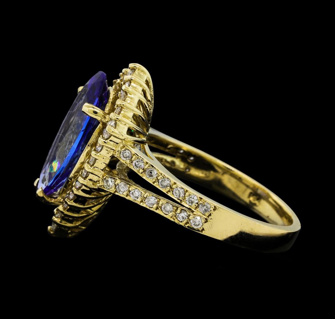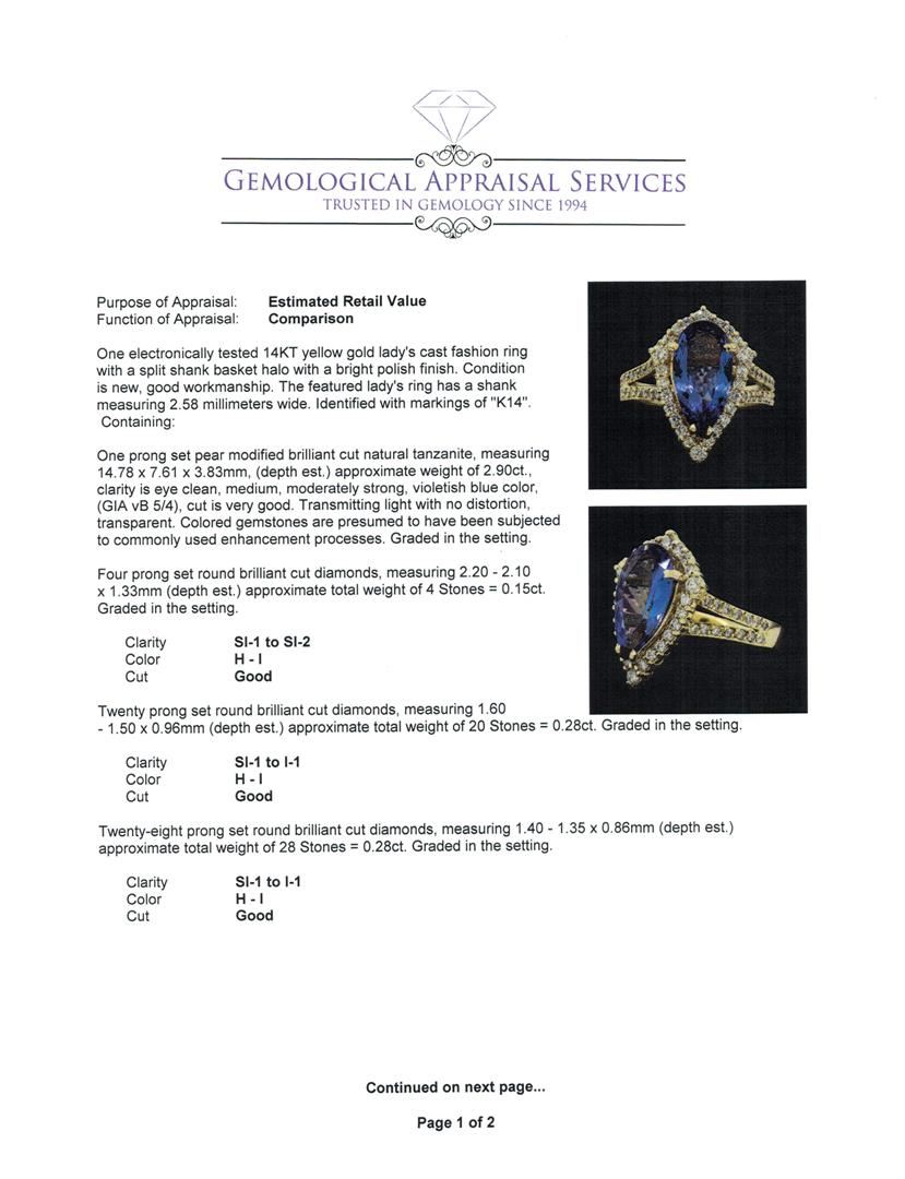 One electronically tested 14KT yellow gold lady's cast fashion ring with a split shank basket halo with a bright polish finish. The featured lady's ring has a shank measuring 2.58 millimeters wide. Identified with markings of 'K14'. Condition is new, good workmanship. Containing: One prong set pear modified brilliant cut natural tanzanite, measuring 14.78 x 7.61 x 3.83mm, (depth est.) approximate weight of 2.90ct., clarity is eye clean, medium, moderately strong, violetish blue color, (GIA vB 5/4), cut is very good. Transmitting light with no distortion, transparent. Colored gemstones are presumed to have been subjected to commonly used enhancement processes. Graded in the setting. Four prong set round brilliant cut diamonds, measuring 2.20 - 2.10 x 1.33mm (depth est.) approximate total weight of 4 Stones = 0.15ct. Graded in the setting. Clarity SI-1 to SI-2. Color: H - I Cut Good Twenty prong set round brilliant cut diamonds, measuring 1.60 - 1.50 x 0.96mm (depth est.) approximate total weight of 20 Stones = 0.28ct. Graded in the setting. Clarity SI-1 to I-1. Color: H - I Cut Good Twenty-Eight prong set round brilliant cut diamonds, measuring 1.40 - 1.35 x 0.86mm (depth est.) approximate total weight of 28 Stones = 0.28ct. Graded in the setting. Clarity SI-1 to I-1. Color: H - I Cut Good. Total Weight of Colored Stones 2.90ct.. Total Weight of Diamonds 0.71ct.. Total Weight of Ring 5.90gm. GAS Appraised at $6,975.00.