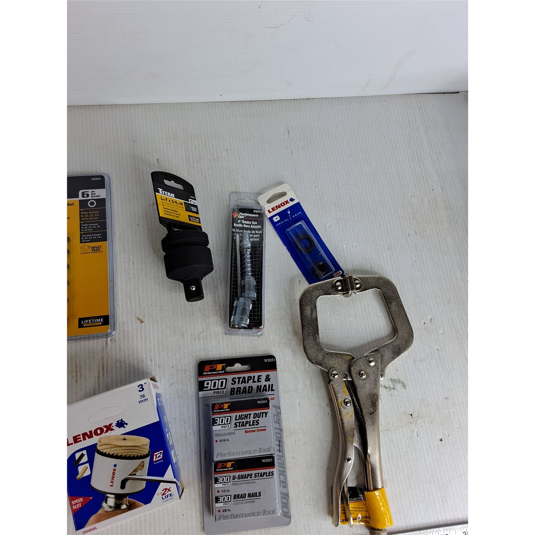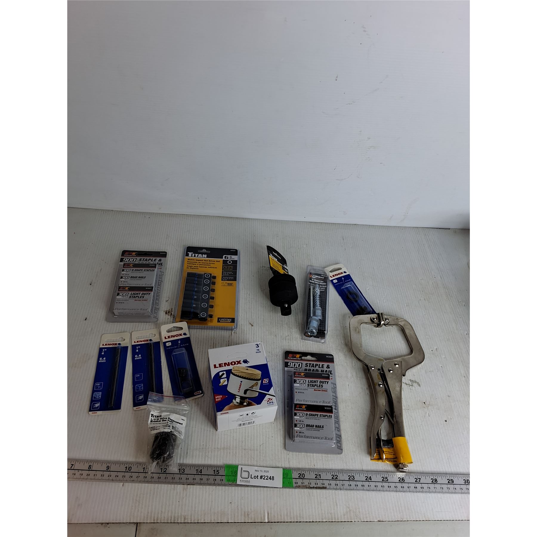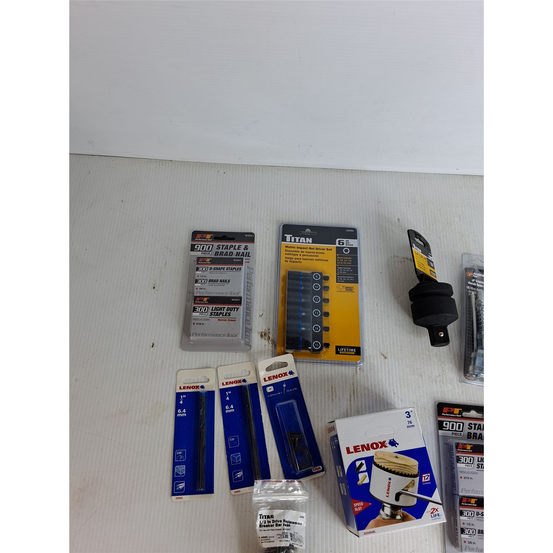 (2) 900 Staples & Brad Nails, Metric Impact Driver Set, Socket Adapter, 4" Grease Gun, 3" Lenox Saw