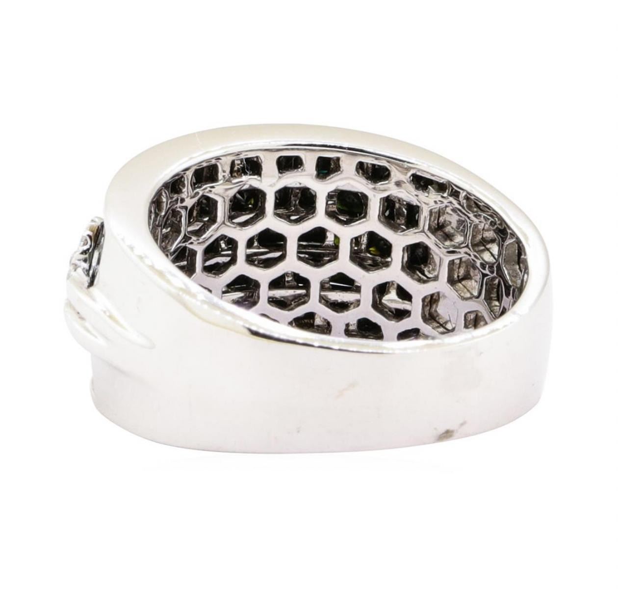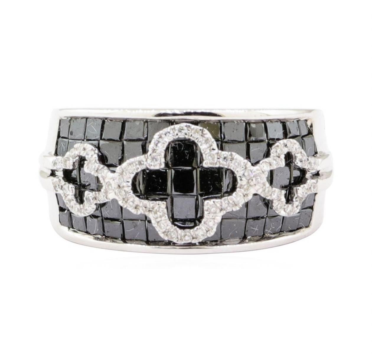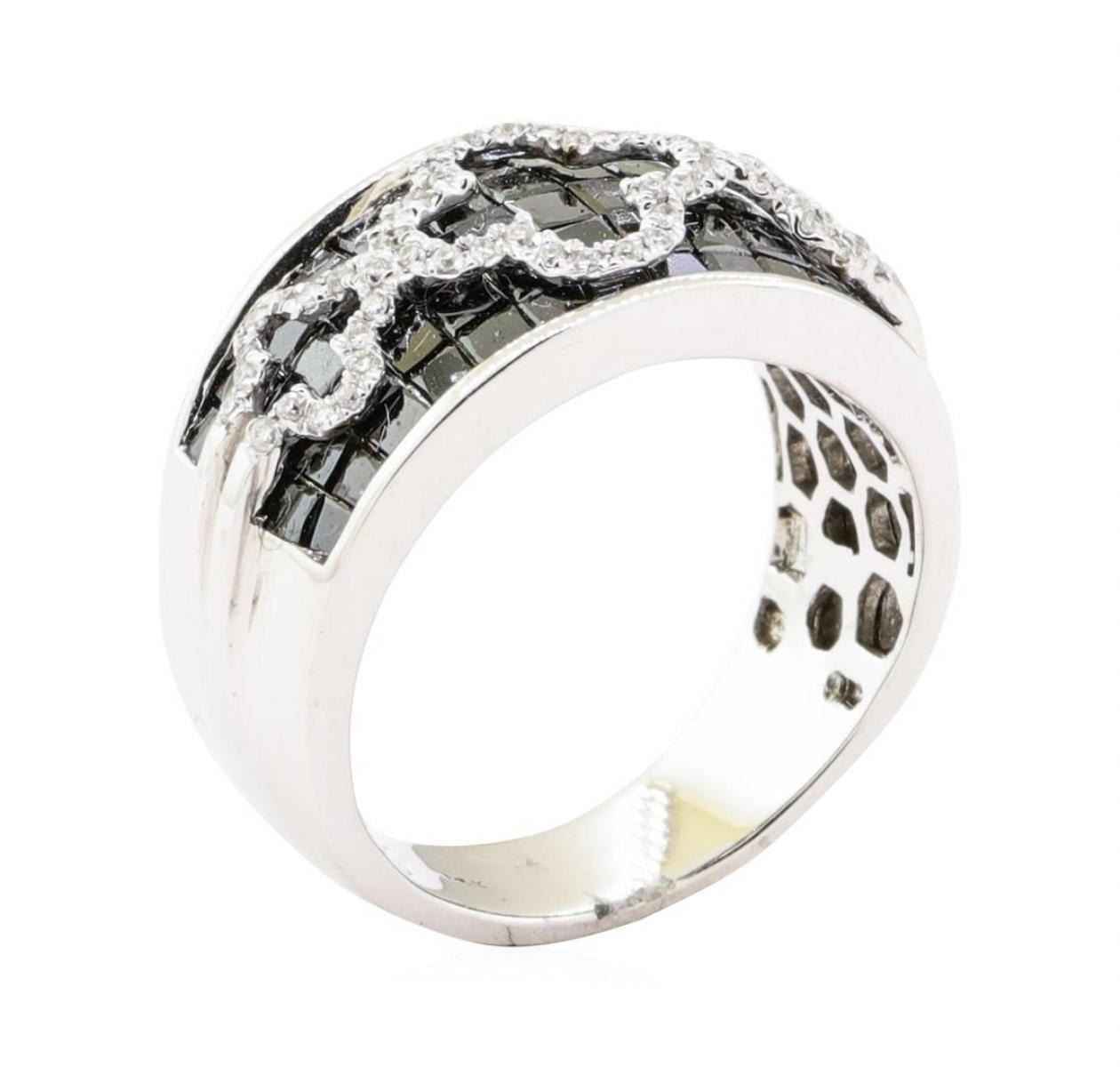 One electronically tested 14KT white gold lady's combination cast & assembled fashion ring with a five row wide band tapered shank with a bright polish finish. The featured lady's ring has a shank measuring 5.00 millimeters wide. Identified with markings of '14K'. Condition is new, good workmanship. Containing: Sixty-Five invisible set princess cut treated diamonds, measuring 2.10 x 1.80 x 1.35mm (depth est.) approximate total weight of 65 Stones = 2.69ct. Colored gemstones are presumed to have been subjected to commonly used enhancement processes. Graded in the setting. Color Fancy Black Cut Good Fifty-Six prong set round brilliant cut diamonds, measuring 1.10 - 1.00 x 0.63mm (depth est.) approximate total weight of 56 Stones = 0.22ct. Graded in the setting. Color H - I Clarity SI-1 to SI-2 Cut Good. Total Weight of Diamonds 2.91ct.. Total Weight of Ring 8.00gm GAS Appraised at $5260.00. GAS Appraised.