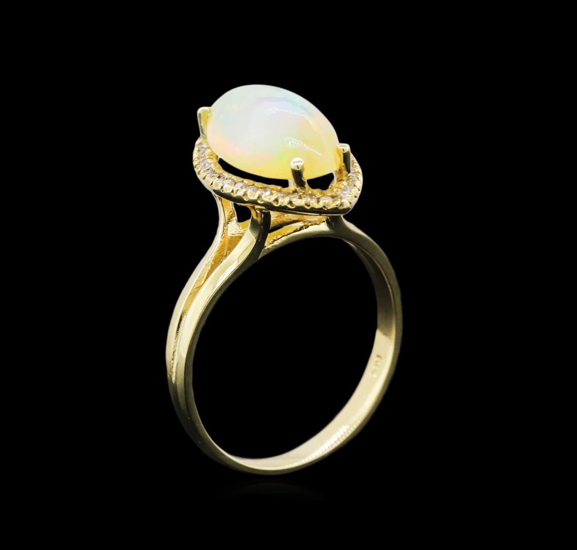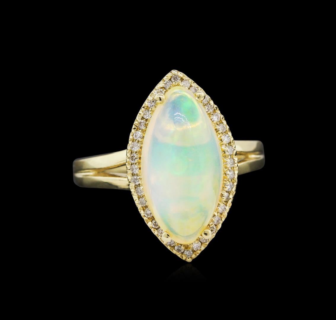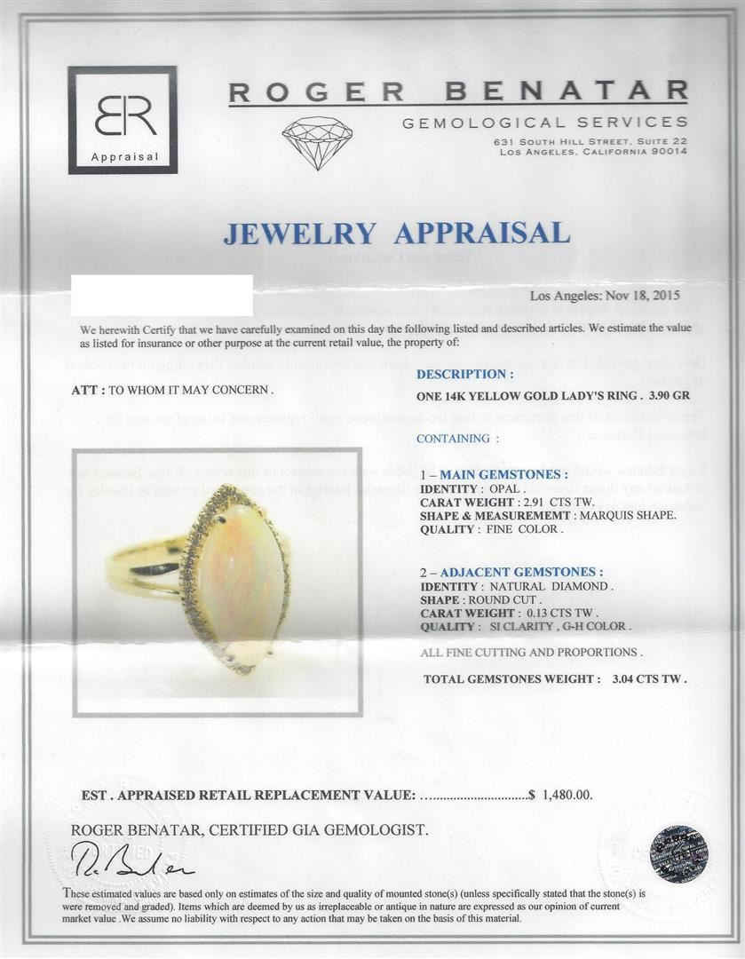 One 14K Yellow Gold Lady's Ring. 3.90 GR. Containing: Main Gemstones: Identity: Opal. Carat Weight 2.91 CTS TW. Shape & Measurement: Marquis Shape. Quality: Fine Color. Adjacent Gemstones: Identity: Natural Diamond. Shape: Round Cut. Carat Weight: 0.13 CTS TW. Quality: SI Clarity, G-H Color. All Fine Cutting And Proportions. Total Gemstones Weight: 3.04 CTW TW. RBGS Appraised.
