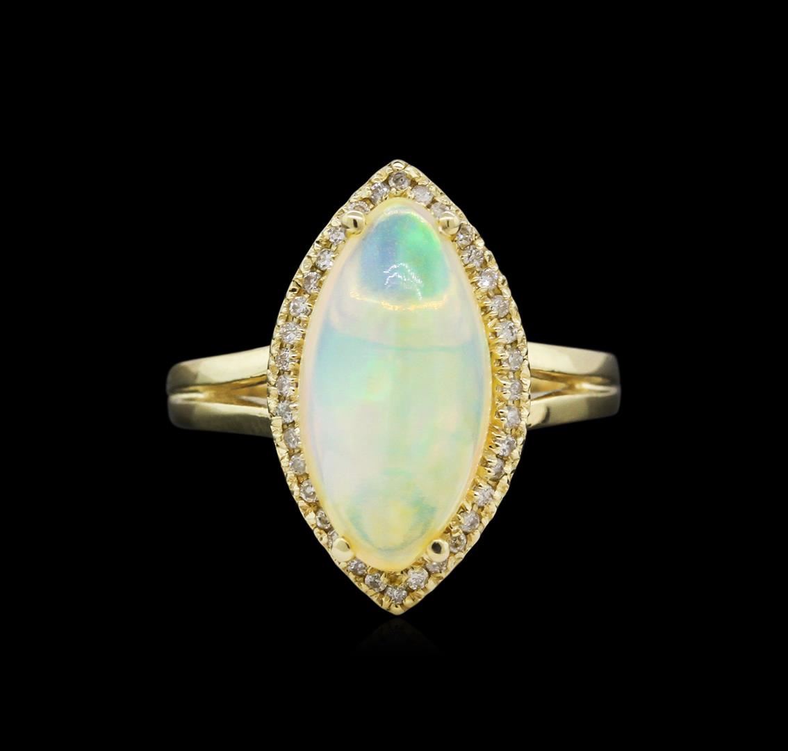 One 14K Yellow Gold Lady's Ring. 3.90 GR. Containing: Main Gemstones: Identity: Opal. Carat Weight 2.91 CTS TW. Shape & Measurement: Marquis Shape. Quality: Fine Color. Adjacent Gemstones: Identity: Natural Diamond. Shape: Round Cut. Carat Weight: 0.13 CTS TW. Quality: SI Clarity, G-H Color. All Fine Cutting And Proportions. Total Gemstones Weight: 3.04 CTW TW. RBGS Appraised.