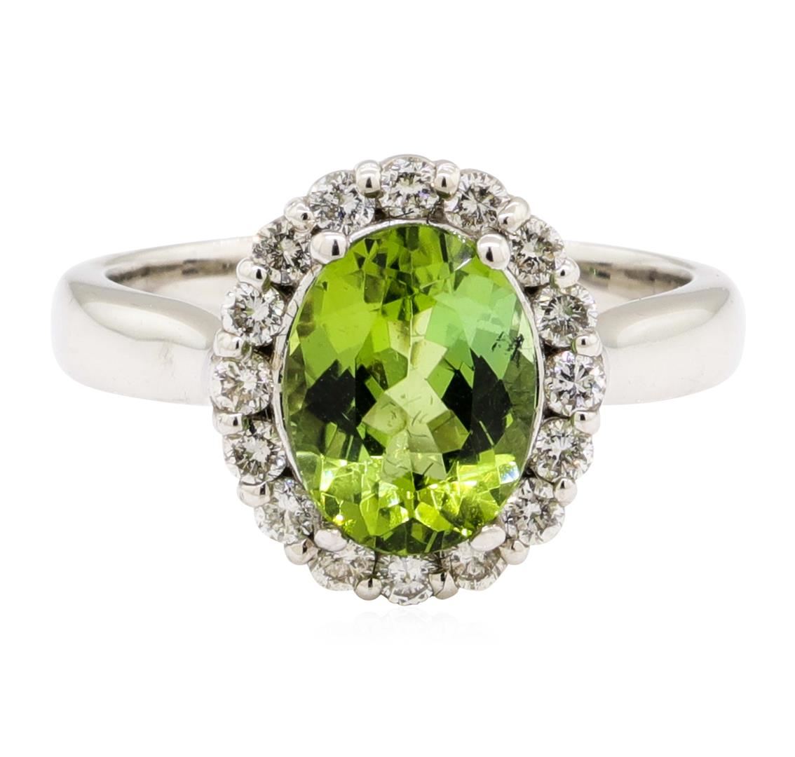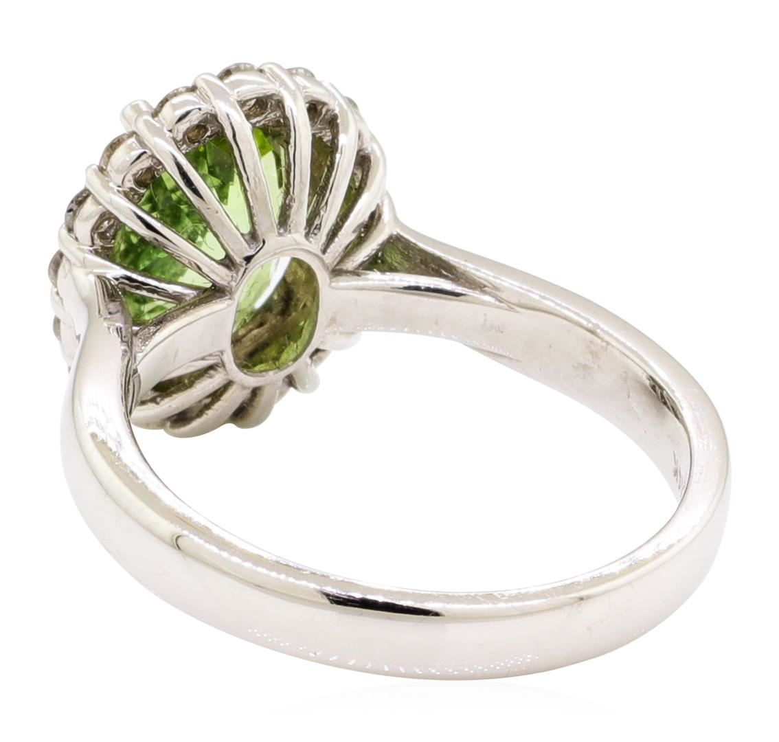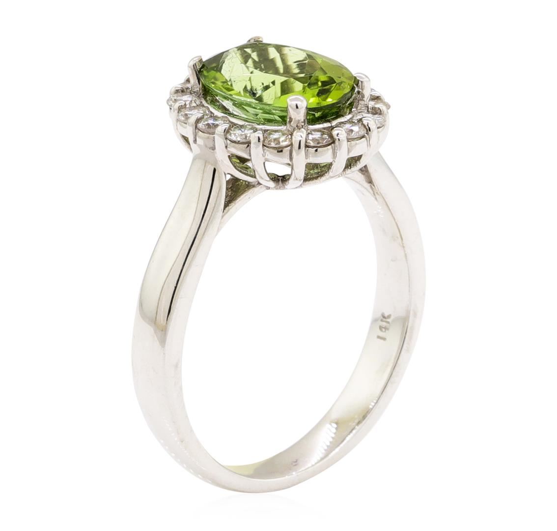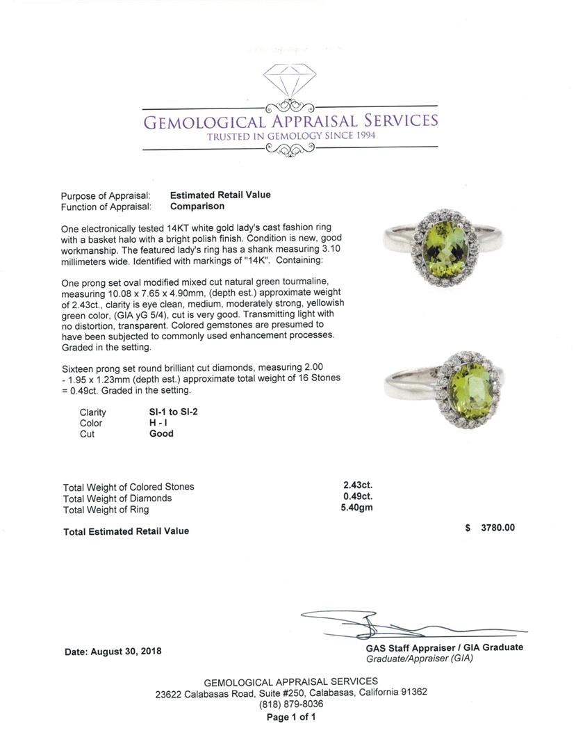 One electronically tested 14KT white gold lady's cast fashion ring with a basket halo with a bright polish finish. The featured lady's ring has a shank measuring 3.10 millimeters wide. Identified with markings of '14K'. Condition is new, good workmanship. Containing: One prong set oval modified mixed cut natural green tourmaline, measuring 10.08 x 7.65 x 4.90mm, (depth est.) approximate weight of 2.43ct., clarity is eye clean, medium, moderately strong, yellowish green color, (GIA yG 5/4), cut is very good. Transmitting light with no distortion, transparent. Colored gemstones are presumed to have been subjected to commonly used enhancement processes. Graded in the setting. Sixteen prong set round brilliant cut diamonds, measuring 2.00 - 1.95 x 1.23mm (depth est.) approximate total weight of 16 Stones = 0.49ct. Graded in the setting. Color H - I Clarity SI-1 to SI-2 Cut Good. Total Weight of Colored Stones 2.43ct.. Total Weight of Diamonds 0.49ct.. Total Weight of Ring 5.40gm GAS Appraised at $3780.00. GAS Appraised at $3,780.00.