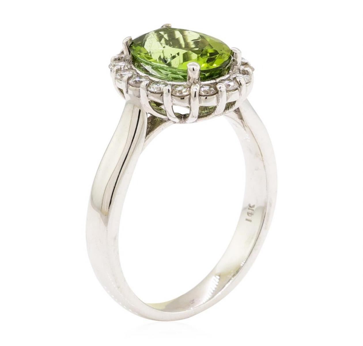 One electronically tested 14KT white gold lady's cast fashion ring with a basket halo with a bright polish finish. The featured lady's ring has a shank measuring 3.10 millimeters wide. Identified with markings of '14K'. Condition is new, good workmanship. Containing: One prong set oval modified mixed cut natural green tourmaline, measuring 10.08 x 7.65 x 4.90mm, (depth est.) approximate weight of 2.43ct., clarity is eye clean, medium, moderately strong, yellowish green color, (GIA yG 5/4), cut is very good. Transmitting light with no distortion, transparent. Colored gemstones are presumed to have been subjected to commonly used enhancement processes. Graded in the setting. Sixteen prong set round brilliant cut diamonds, measuring 2.00 - 1.95 x 1.23mm (depth est.) approximate total weight of 16 Stones = 0.49ct. Graded in the setting. Color H - I Clarity SI-1 to SI-2 Cut Good. Total Weight of Colored Stones 2.43ct.. Total Weight of Diamonds 0.49ct.. Total Weight of Ring 5.40gm GAS Appraised at  $3780.00. GAS Appraised.