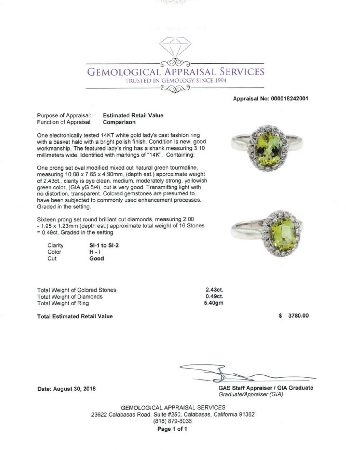 One electronically tested 14KT white gold lady's cast fashion ring with a basket halo with a bright polish finish. The featured lady's ring has a shank measuring 3.10 millimeters wide. Identified with markings of '14K'. Condition is new, good workmanship. Containing: One prong set oval modified mixed cut natural green tourmaline, measuring 10.08 x 7.65 x 4.90mm, (depth est.) approximate weight of 2.43ct., clarity is eye clean, medium, moderately strong, yellowish green color, (GIA yG 5/4), cut is very good. Transmitting light with no distortion, transparent. Colored gemstones are presumed to have been subjected to commonly used enhancement processes. Graded in the setting. Sixteen prong set round brilliant cut diamonds, measuring 2.00 - 1.95 x 1.23mm (depth est.) approximate total weight of 16 Stones = 0.49ct. Graded in the setting. Color H - I Clarity SI-1 to SI-2 Cut Good. Total Weight of Colored Stones 2.43ct.. Total Weight of Diamonds 0.49ct.. Total Weight of Ring 5.40gm GAS Appraised at $3780.00. GAS Appraised.