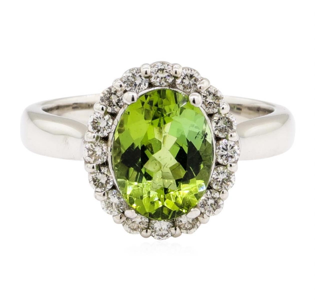 One electronically tested 14KT white gold lady's cast fashion ring with a basket halo with a bright polish finish. The featured lady's ring has a shank measuring 3.10 millimeters wide. Identified with markings of '14K'. Condition is new, good workmanship. Containing: One prong set oval modified mixed cut natural green tourmaline, measuring 10.08 x 7.65 x 4.90mm, (depth est.) approximate weight of 2.43ct., clarity is eye clean, medium, moderately strong, yellowish green color, (GIA yG 5/4), cut is very good. Transmitting light with no distortion, transparent. Colored gemstones are presumed to have been subjected to commonly used enhancement processes. Graded in the setting. Sixteen prong set round brilliant cut diamonds, measuring 2.00 - 1.95 x 1.23mm (depth est.) approximate total weight of 16 Stones = 0.49ct. Graded in the setting. Color H - I Clarity SI-1 to SI-2 Cut Good. Total Weight of Colored Stones 2.43ct.. Total Weight of Diamonds 0.49ct.. Total Weight of Ring 5.40gm GAS Appraised at $3780.00. GAS Appraised.