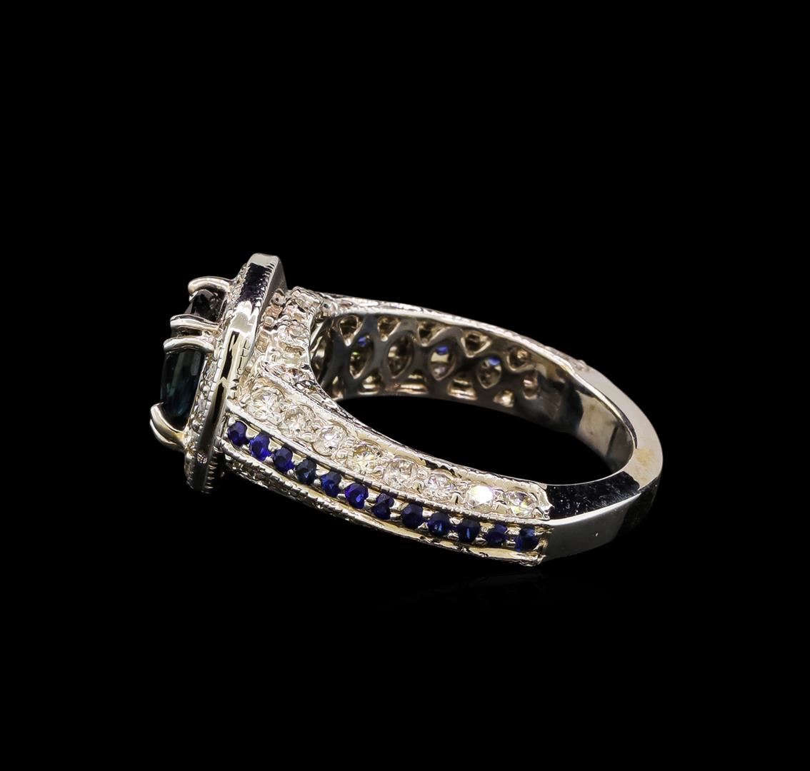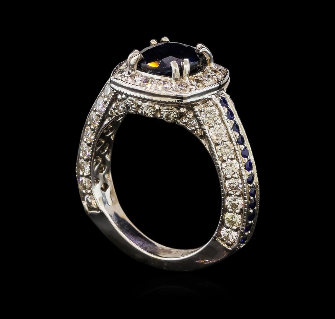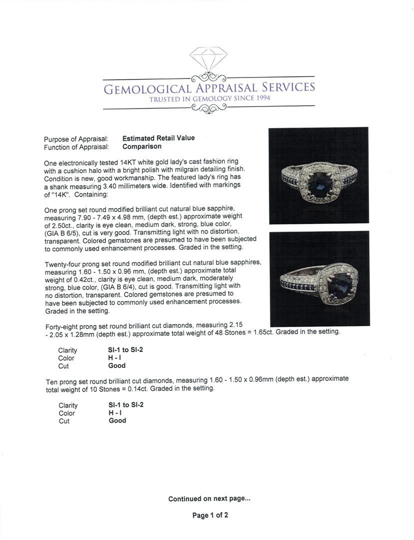 One electronically tested 14KT white gold lady's cast fashion ring with a cushion halo with a bright polish with milgrain detailing finish. The featured lady's ring has a shank measuring 3.40 millimeters wide. Identified with markings of '14K'. Condition is new, good workmanship. Containing: One prong set round modified brilliant cut natural blue sapphire, measuring 7.90 - 7.49 x 4.98 mm, (depth est.) approximate weight of 2.50ct., clarity is eye clean, medium dark, strong, blue color, (GIA B 6/5), cut is very good. Transmitting light with no distortion, transparent. Colored gemstones are presumed to have been subjected to commonly used enhancement processes. Graded in the setting. Twenty-four prong set round modified brilliant cut natural blue sapphires, measuring 1.60 - 1.50 x 0.96 mm, (depth est.) approximate total weight of 0.42ct., clarity is eye clean, medium dark, moderately strong, blue color, (GIA B 6/4), cut is good. Transmitting light with no distortion, transparent. Colored gemstones are presumed to have been subjected to commonly used enhancement processes. Graded in the setting. Forty-Eight prong set round brilliant cut diamonds, measuring 2.15 - 2.05 x 1.28mm (depth est.) approximate total weight of 48 Stones = 1.65ct. Graded in the setting. Clarity SI-1 to SI-2. Color: H - I Cut Good Ten prong set round brilliant cut diamonds, measuring 1.60 - 1.50 x 0.96mm (depth est.) approximate total weight of 10 Stones = 0.14ct. Graded in the setting. Clarity SI-1 to SI-2. Color: H - I Cut Good Four prong set round brilliant cut diamonds, measuring 1.10 - 1.00 x 0.65mm (depth est.) approximate total weight of 4 Stones = 0.02ct. Graded in the setting. Clarity VS-2 to SI-1. Color: H - I Cut Good. Total Weight of Colored Stones 2.92ct.. Total Weight of Diamonds 1.81ct.. Total Weight of Ring 8.70gm. GAS Appraised at $21,160.00.