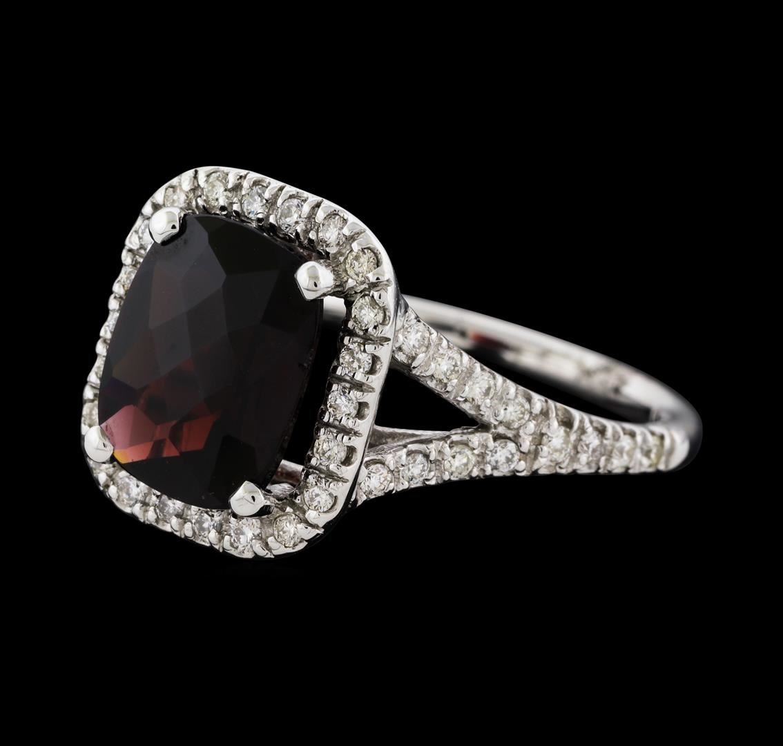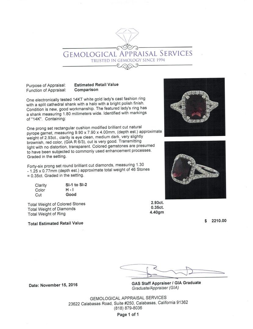 One electronically tested 14KT white gold lady's cast fashion ring with a split cathedral shank with a halo with a bright polish finish. The featured lady's ring has a shank measuring 1.80 millimeters wide. Identified with markings of '14K'. Condition is new, good workmanship. Containing: One prong set rectangular cushion modified brilliant cut natural pyrope garnet, measuring 9.90 x 7.90 x 4.00mm, (depth est.) approximate weight of 2.93ct., clarity is eye clean, medium dark, very slightly brownish, red color, (GIA R 6/3), cut is very good. Transmitting light with no distortion, transparent. Colored gemstones are presumed to have been subjected to commonly used enhancement processes. Graded in the setting. Forty-Six prong set round brilliant cut diamonds, measuring 1.30 - 1.25 x 0.77mm (depth est.) approximate total weight of 46 Stones = 0.35ct. Graded in the setting. Clarity SI-1 to SI-2. Color: H - I Cut Good. Total Weight of Colored Stones 2.93ct.. Total Weight of Diamonds 0.35ct.. Total Weight of Ring 4.40gm. GAS Appraised at $2,210.00.