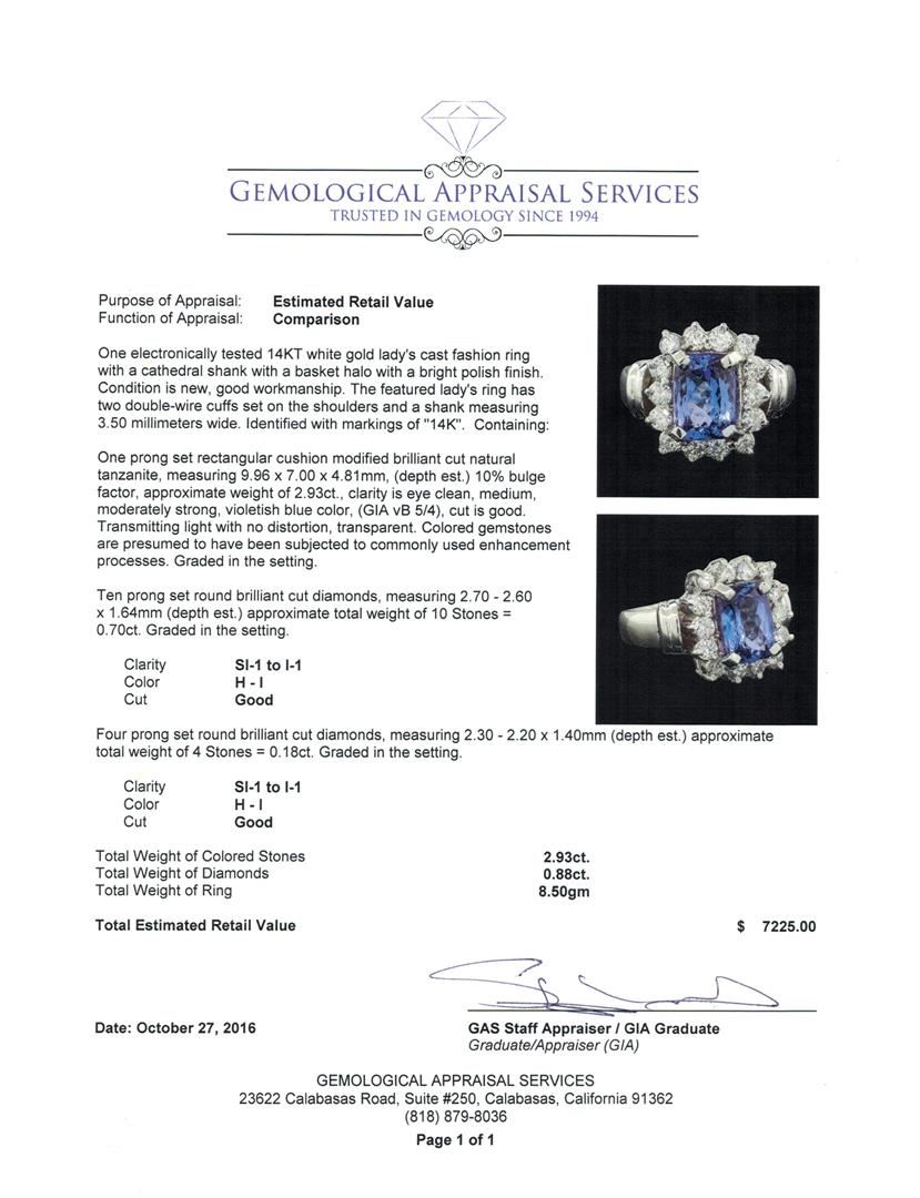 One electronically tested 14KT white gold lady's cast fashion ring with a cathedral shank with a basket halo with a bright polish finish. The featured lady's ring has two double-wire cuffs set on the shoulders and a shank measuring 3.50 millimeters wide. Identified with markings of '14K'. Condition is new, good workmanship. Containing: One prong set rectangular cushion modified brilliant cut natural tanzanite, measuring 9.96 x 7.00 x 4.81mm, (depth est.) 10%. bulge factor, approximate weight of 2.93ct., clarity is eye clean, medium, moderately strong, violetish blue color, (GIA vB 5/4), cut is good. Transmitting light with no distortion, transparent. Colored gemstones are presumed to have been subjected to commonly used enhancement processes. Graded in the setting. Ten prong set round brilliant cut diamonds, measuring 2.70 - 2.60 x 1.64mm (depth est.) approximate total weight of 10 Stones = 0.70ct. Graded in the setting. Clarity SI-1 to I-1. Color: H - I Cut Good Four prong set round brilliant cut diamonds, measuring 2.30 - 2.20 x 1.40mm (depth est.) approximate total weight of 4 Stones = 0.18ct. Graded in the setting. Clarity SI-1 to I-1. Color: H - I Cut Good. Total Weight of Colored Stones 2.93ct.. Total Weight of Diamonds 0.88ct.. Total Weight of Ring 8.50gm. GAS Appraised at $7,225.00.