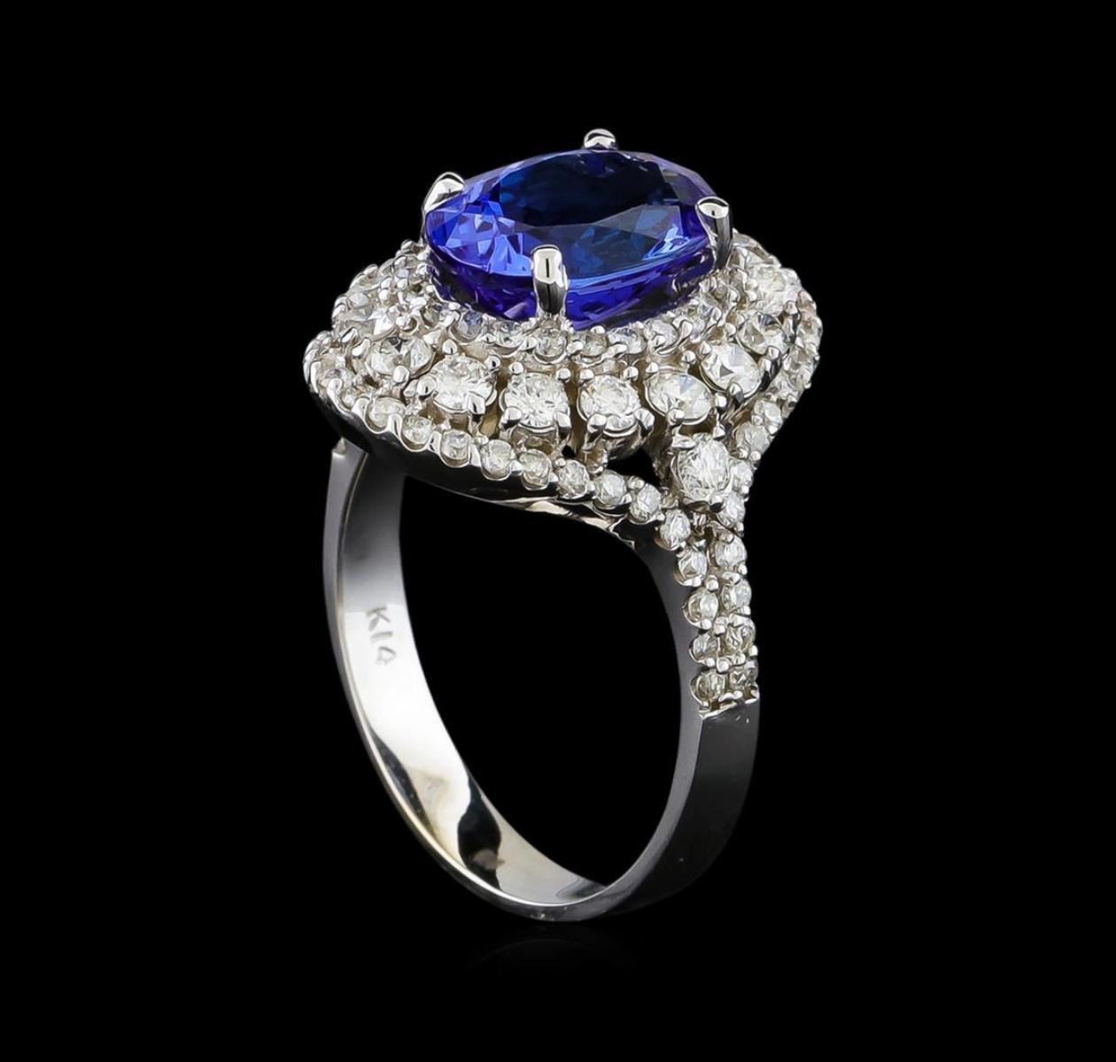 One electronically tested 14KT white gold lady's cast fashion ring with a triple halo with a bright polish finish. The featured lady's ring has a shank measuring 3.13 millimeters wide. Identified with markings of "K14". Condition is new, good workmanship. Containing: One prong set oval modified brilliant cut natural tanzanite, measuring 10.33 x 7.64 x 5.24mm, approximate weight of 2.93ct., clarity is eye clean, type I, medium, moderately strong, bluish violet color, (GIA bV 5/4), cut is very good. Transmitting light with no distortion, transparent. Colored gemstones are presumed to have been subjected to commonly used enhancement processes. Graded in the setting. Eighteen prong set round brilliant cut diamonds, measuring 2.20 - 2.10 x 1.33mm (depth est.) approximate total weight of 18 Stones = 0.67ct. Graded in the setting. Clarity: SI-1 to SI-2. Color: H - I. Cut Good Seventy-Eight prong set round brilliant cut diamonds, measuring 1.30 - 1.20 x 0.78mm (depth est.) approximate total weight of 78 Stones = 0.60ct. Graded in the setting. Clarity: SI-2 to I-1. Color: H - I. Cut Good. Total Weight of Colored Stones 2.93ct. Total Weight of Diamonds 1.27ct. Total Weight of Ring 6.10gm GAS Appraised.