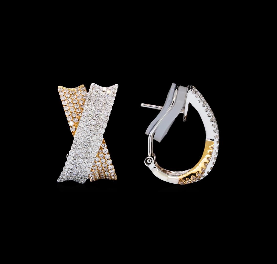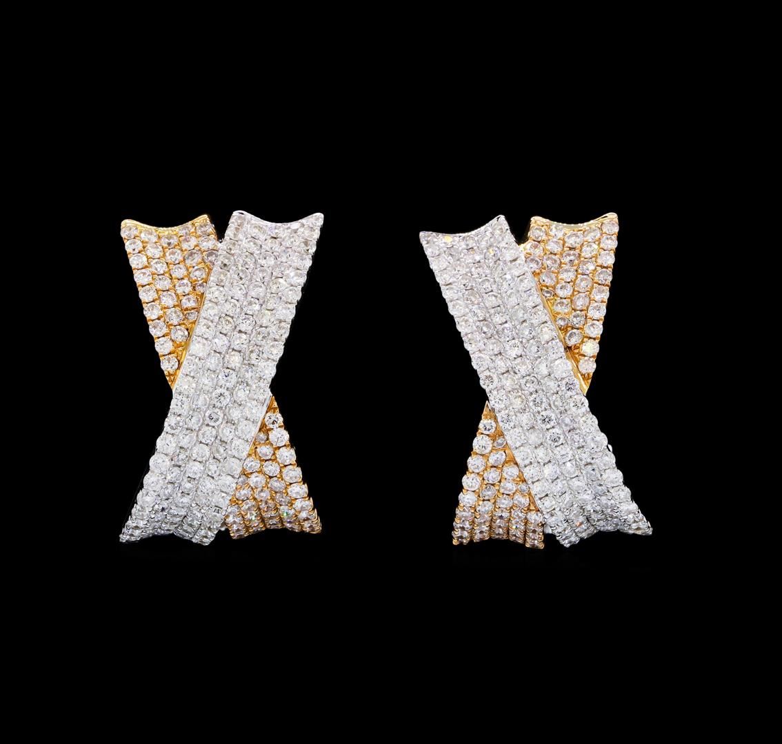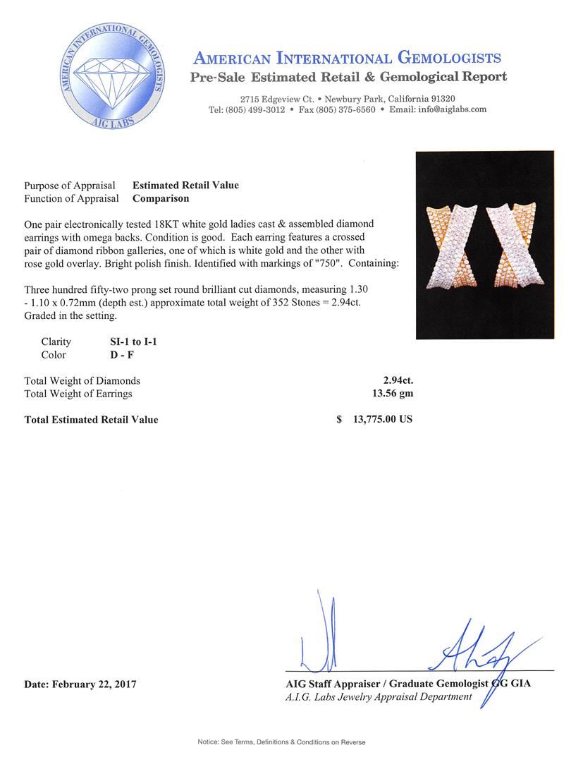 One pair electronically tested 18KT white gold ladies cast & assembled diamond earrings with omega backs. Each earring features a crossed pair of diamond ribbon galleries, one of which is white gold and the other with rose gold overlay. Bright polish finish. Identified with markings of '750'. Condition is good. Containing: Three Hundred Fifty-Two prong set round brilliant cut diamonds, measuring 1.30 - 1.10 x 0.72mm (depth est.) approximate total weight of 352 Stones = 2.94ct. Graded in the setting. Clarity SI-1 to I-1. Color: D - F. Total Weight of Diamonds 2.94ct.. Total Weight of Earrings 13.56gm. AIG Appraised at $13,775.00.