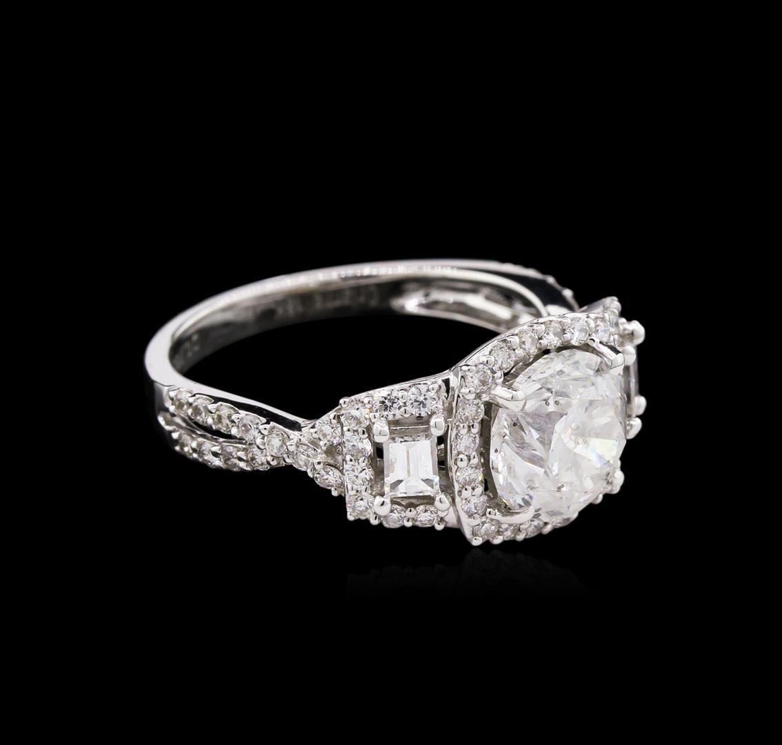 One electronically tested 18KT white gold ladies cast diamond unity ring with a bright polish finish. The featured diamond is set within a diamond bezel supported by elaborate intertwining diamond set shoulders, completed by a two millimeter wide band. Trademark is Orianne. Identified with markings of "18K". Condition is new, good workmanship. Containing: One prong set round brilliant cut diamond, measuring 7.77 - 7.75 x 5.15mm (depth est.), 10.00.%. GTCF approximate weight of 2.16ct with a medium blue fluorescence. Graded in the setting. Clarity: I-1. Color: H. Depth 66.4%. Table 59.3%. Sixty-Two prong set round brilliant & baguette cut diamonds approximate total weight of 62 Stones = 0.78ct. Graded in the setting. Clarity: VS-2 to SI-2. Color: G - I. Total Weight of Diamonds 2.94ct. Total Weight of Ring 4.64gm. AIG Appraised at $38,010.00.