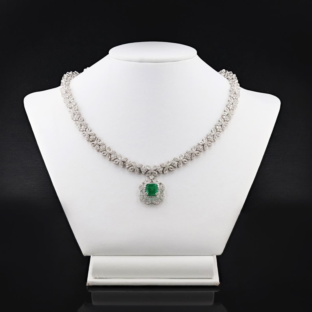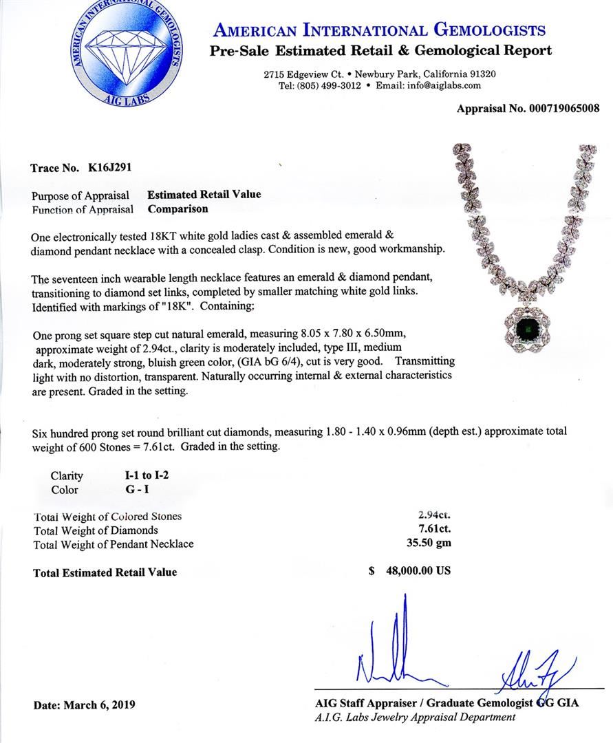 2.94ct Emerald and 7.61ctw Diamond 18K White Gold Necklace. Please see Photos and Description for all available information. This elegant 18K white gold necklace features a 2.94ct emerald and 7.61ctw of round brilliant cut diamonds. The emerald is set in a four-prong setting and the diamonds are prong-set in a chevron pattern. The necklace is suspended from an 18K white gold chain.