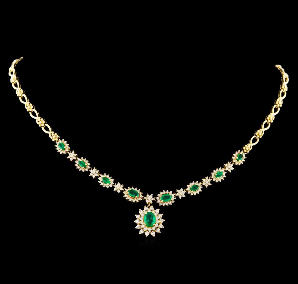 One electronically tested 14KT yellow gold lady's combination cast & assembled fashion necklace with a tongue clasp with foldover safety with a bright polish finish. The featured lady's necklace has 8 diamond halo sections with a double halo dangle. The necklace measures 17.5 inches in length. Identified with markings of "14K". Condition is used, good workmanship. Containing: One prong set oval modified brilliant cut natural emerald, measuring 8.00 x 6.12 x 3.37mm, (depth est.) 7%. bulge factor, approximate total weight of 1.01ct., clarity is moderately included, medium, moderately strong, green color, (GIA G 5/4), cut is good. Transmitting light somewhat diffusely, transparent to translucent. Colored gemstones are presumed to have been subjected to commonly used enhancement processes. Indications of oil residue. Graded in the setting. Two prong set oval modified brilliant cut natural emeralds, measuring 6.07 x 4.15 x 2.63mm, (depth est.) approximate total weight of 0.85ct., clarity is moderately included, medium, moderately strong, green color, (GIA G 5/4), cut is good. Transmitting light somewhat diffusely, transparent to translucent. Colored gemstones are presumed to have been subjected to commonly used enhancement processes. Indications of oil residue. Graded in the setting. Six prong set oval modified brilliant cut natural emeralds, measuring 4.80 x 3.10 x 2.15mm, (depth est.) approximate total weight of 1.08ct., clarity is moderately included, medium, moderately strong, green color, (GIA G 5/4), cut is good. Transmitting light somewhat diffusely, transparent to translucent. Colored gemstones are presumed to have been subjected to commonly used enhancement processes. Indications of oil residue. Graded in the setting. Fourteen prong set round brilliant cut diamonds, measuring 2.00 - 1.90 x 1.23mm (depth est.) approximate total weight of 14 Stones = 0.40ct. Graded in the setting. Clarity: VS-2 to SI-2. Color: H - I. Cut Good Fourteen prong set round brilliant cut diamonds, measuring 1.70 - 1.65 x 1.04mm (depth est.) approximate total weight of 14 Stones = 0.26ct. Graded in the setting. Clarity: SI-1 to SI-2. Color: G - Good One Hundred Forty-Nine prong set round brilliant cut diamonds, measuring 1.50 - 1.40 x 0.90mm (depth est.) approximate total weight of 149 Stones = 1.70ct. Graded in the setting. Clarity: SI-1 to SI-2. Color: H - I. Cut Good. Total Weight of Colored Stones 2.94ct. Total Weight of Diamonds 2.36ct. Total Weight of Necklace 26.70gm. GAS Appraised at $10,900.00.