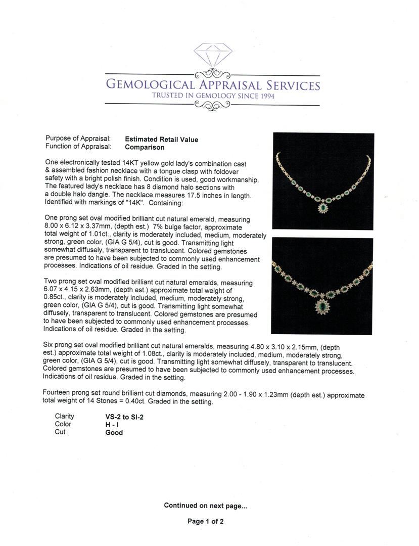 One electronically tested 14KT yellow gold lady's combination cast & assembled fashion necklace with a tongue clasp with foldover safety with a bright polish finish. The featured lady's necklace has 8 diamond halo sections with a double halo dangle. The necklace measures 17.5 inches in length. Identified with markings of "14K". Condition is used, good workmanship. Containing: One prong set oval modified brilliant cut natural emerald, measuring 8.00 x 6.12 x 3.37mm, (depth est.) 7%. bulge factor, approximate total weight of 1.01ct., clarity is moderately included, medium, moderately strong, green color, (GIA G 5/4), cut is good. Transmitting light somewhat diffusely, transparent to translucent. Colored gemstones are presumed to have been subjected to commonly used enhancement processes. Indications of oil residue. Graded in the setting. Two prong set oval modified brilliant cut natural emeralds, measuring 6.07 x 4.15 x 2.63mm, (depth est.) approximate total weight of 0.85ct., clarity is moderately included, medium, moderately strong, green color, (GIA G 5/4), cut is good. Transmitting light somewhat diffusely, transparent to translucent. Colored gemstones are presumed to have been subjected to commonly used enhancement processes. Indications of oil residue. Graded in the setting. Six prong set oval modified brilliant cut natural emeralds, measuring 4.80 x 3.10 x 2.15mm, (depth est.) approximate total weight of 1.08ct., clarity is moderately included, medium, moderately strong, green color, (GIA G 5/4), cut is good. Transmitting light somewhat diffusely, transparent to translucent. Colored gemstones are presumed to have been subjected to commonly used enhancement processes. Indications of oil residue. Graded in the setting. Fourteen prong set round brilliant cut diamonds, measuring 2.00 - 1.90 x 1.23mm (depth est.) approximate total weight of 14 Stones = 0.40ct. Graded in the setting. Clarity: VS-2 to SI-2. Color: H - I. Cut Good Fourteen prong set round brilliant cut diamonds, measuring 1.70 - 1.65 x 1.04mm (depth est.) approximate total weight of 14 Stones = 0.26ct. Graded in the setting. Clarity: SI-1 to SI-2. Color: G - Good One Hundred Forty-Nine prong set round brilliant cut diamonds, measuring 1.50 - 1.40 x 0.90mm (depth est.) approximate total weight of 149 Stones = 1.70ct. Graded in the setting. Clarity: SI-1 to SI-2. Color: H - I. Cut Good. Total Weight of Colored Stones 2.94ct. Total Weight of Diamonds 2.36ct. Total Weight of Necklace 26.70gm. GAS Appraised at $10,900.00.