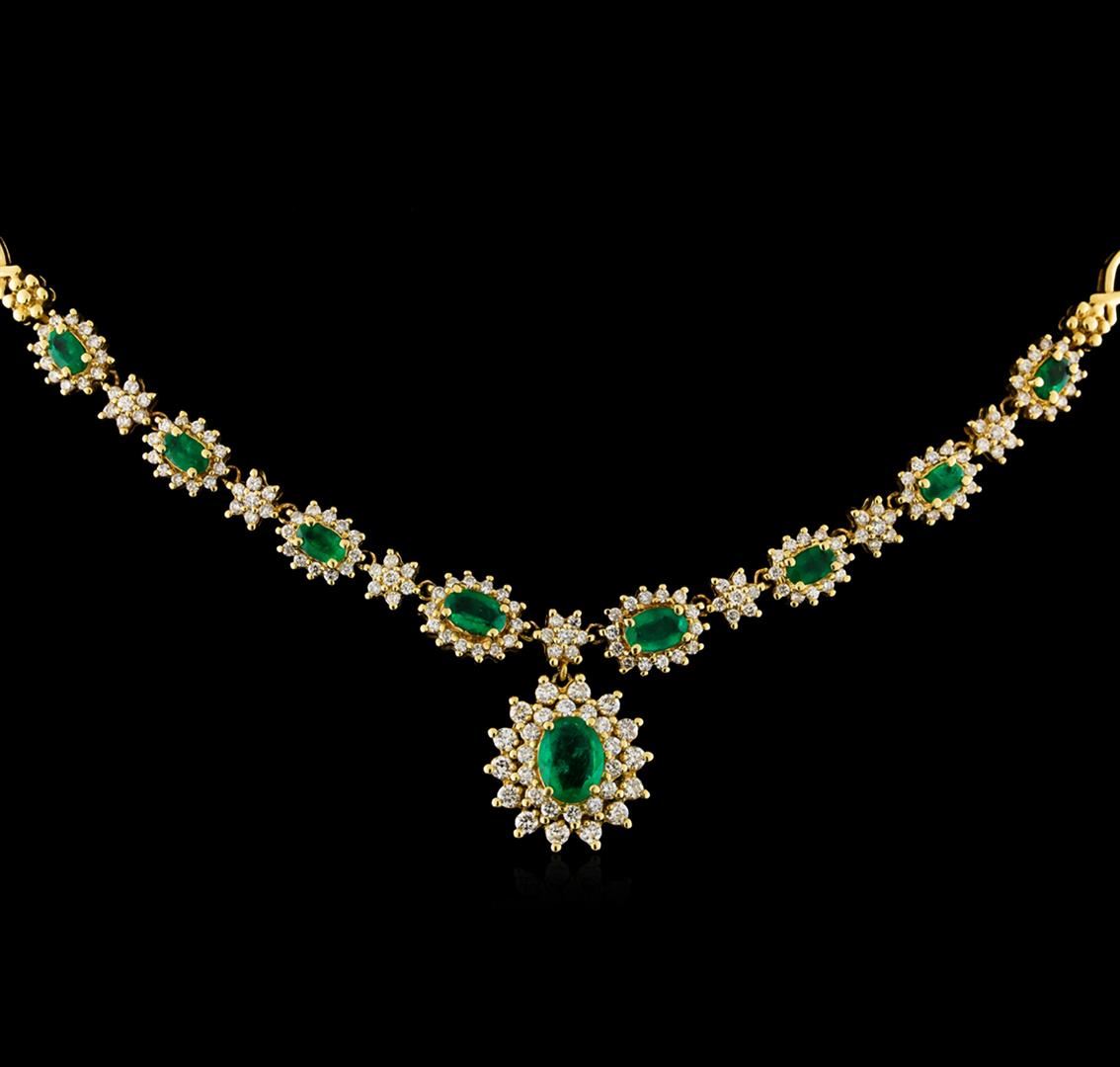 One electronically tested 14KT yellow gold lady's combination cast & assembled fashion necklace with a tongue clasp with foldover safety with a bright polish finish. The featured lady's necklace has 8 diamond halo sections with a double halo dangle. The necklace measures 17.5 inches in length. Identified with markings of "14K". Condition is used, good workmanship. Containing: One prong set oval modified brilliant cut natural emerald, measuring 8.00 x 6.12 x 3.37mm, (depth est.) 7%. bulge factor, approximate total weight of 1.01ct., clarity is moderately included, medium, moderately strong, green color, (GIA G 5/4), cut is good. Transmitting light somewhat diffusely, transparent to translucent. Colored gemstones are presumed to have been subjected to commonly used enhancement processes. Indications of oil residue. Graded in the setting. Two prong set oval modified brilliant cut natural emeralds, measuring 6.07 x 4.15 x 2.63mm, (depth est.) approximate total weight of 0.85ct., clarity is moderately included, medium, moderately strong, green color, (GIA G 5/4), cut is good. Transmitting light somewhat diffusely, transparent to translucent. Colored gemstones are presumed to have been subjected to commonly used enhancement processes. Indications of oil residue. Graded in the setting. Six prong set oval modified brilliant cut natural emeralds, measuring 4.80 x 3.10 x 2.15mm, (depth est.) approximate total weight of 1.08ct., clarity is moderately included, medium, moderately strong, green color, (GIA G 5/4), cut is good. Transmitting light somewhat diffusely, transparent to translucent. Colored gemstones are presumed to have been subjected to commonly used enhancement processes. Indications of oil residue. Graded in the setting. Fourteen prong set round brilliant cut diamonds, measuring 2.00 - 1.90 x 1.23mm (depth est.) approximate total weight of 14 Stones = 0.40ct. Graded in the setting. Clarity: VS-2 to SI-2. Color: H - I. Cut Good Fourteen prong set round brilliant cut diamonds, measuring 1.70 - 1.65 x 1.04mm (depth est.) approximate total weight of 14 Stones = 0.26ct. Graded in the setting. Clarity: SI-1 to SI-2. Color: G - Good One Hundred Forty-Nine prong set round brilliant cut diamonds, measuring 1.50 - 1.40 x 0.90mm (depth est.) approximate total weight of 149 Stones = 1.70ct. Graded in the setting. Clarity: SI-1 to SI-2. Color: H - I. Cut Good. Total Weight of Colored Stones 2.94ct. Total Weight of Diamonds 2.36ct. Total Weight of Necklace 26.70gm. GAS Appraised at $10,900.00.