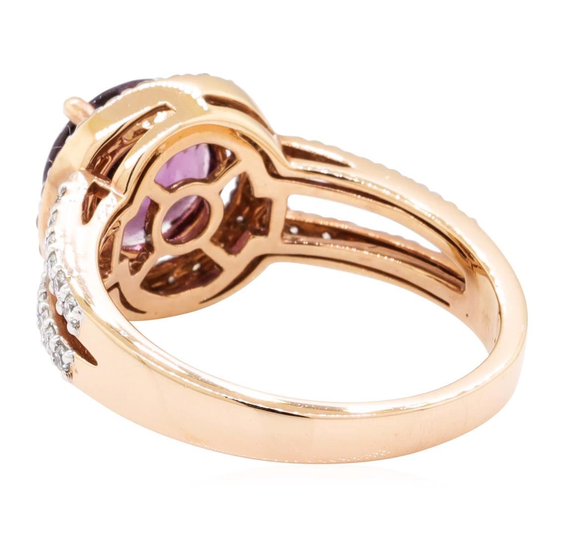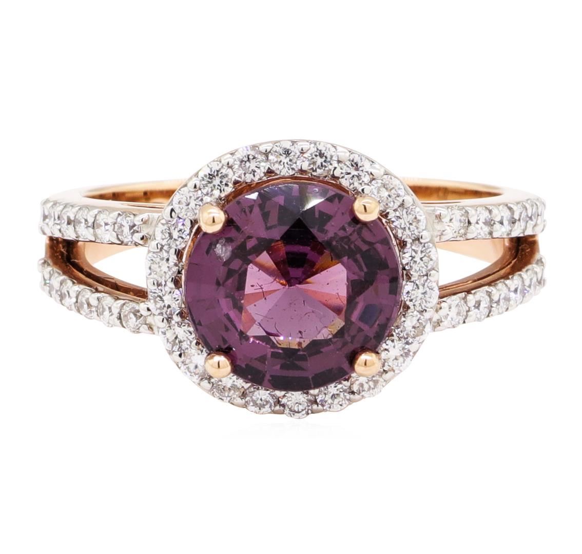 One electronically tested 14KT rose gold lady's cast fashion ring with a split shank halo with a bright polish finish. The featured lady's ring has a shank measuring 2.57 millimeters wide. Identified with markings of '14K'. Condition is new, good workmanship. Containing: One prong set round modified mixed cut natural lavender spinel, measuring 8.78 - 8.57 x 4.58 mm, (depth est.) approximate weight of 2.43ct., clarity is slightly included, medium, moderately strong, reddish purple color, (GIA rP 5/4), cut is very good. Transmitting light with a minimum of distortion, transparent. Colored gemstones are presumed to have been subjected to commonly used enhancement processes. Graded in the setting. Forty-Six prong set round brilliant cut diamonds, measuring 1.50 - 1.40 x 0.87mm (depth est.) approximate total weight of 46 Stones = 0.51ct. Graded in the setting. The area surrounding the diamonds has been rhodium plated. Color G - H Clarity VS-2 to SI-1 Cut Very Good. Total Weight of Colored Stones 2.43ct.. Total Weight of Diamonds 0.51ct.. Total Weight of Ring 4.60gm GAS Appraised at $6405.00. GAS Appraised at $6,405.00.