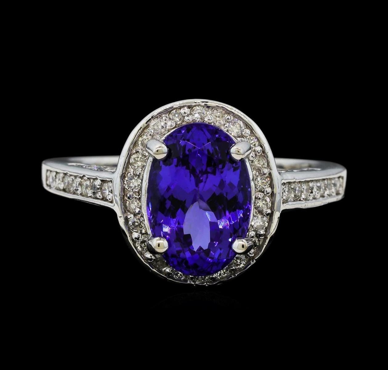 One electronically tested 14KT white gold lady's cast fashion ring with a cathedral shank with a basket halo with a bright polish finish. The featured lady's ring has a shank measuring 1.54 millimeters wide. Identified with markings of '14K'. Condition is new, good workmanship. Containing: One prong set oval modified brilliant cut natural tanzanite, measuring 10.08 x 6.90 x 5.76mm, (depth est.) approximate weight of 2.94ct., clarity is eye clean, medium dark, strong, violetish blue color, (GIA vB 6/5), cut is very good. Transmitting light with no distortion, transparent. Colored gemstones are presumed to have been subjected to commonly used enhancement processes. Graded in the setting. Fifty-Eight prong set round brilliant cut diamonds, measuring 1.35 - 1.20 x 0.77mm (depth est.) approximate total weight of 58 Stones = 0.44ct. Graded in the setting. Clarity SI-1 to I-1. Color: G - H Cut Good. Total Weight of Colored Stones 2.94ct.. Total Weight of Diamonds 0.44ct.. Total Weight of Ring 4.70gm.
