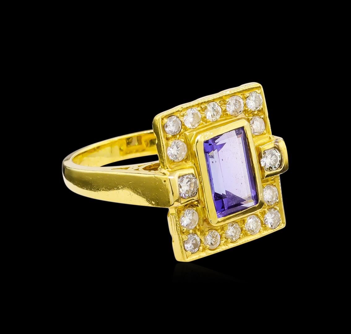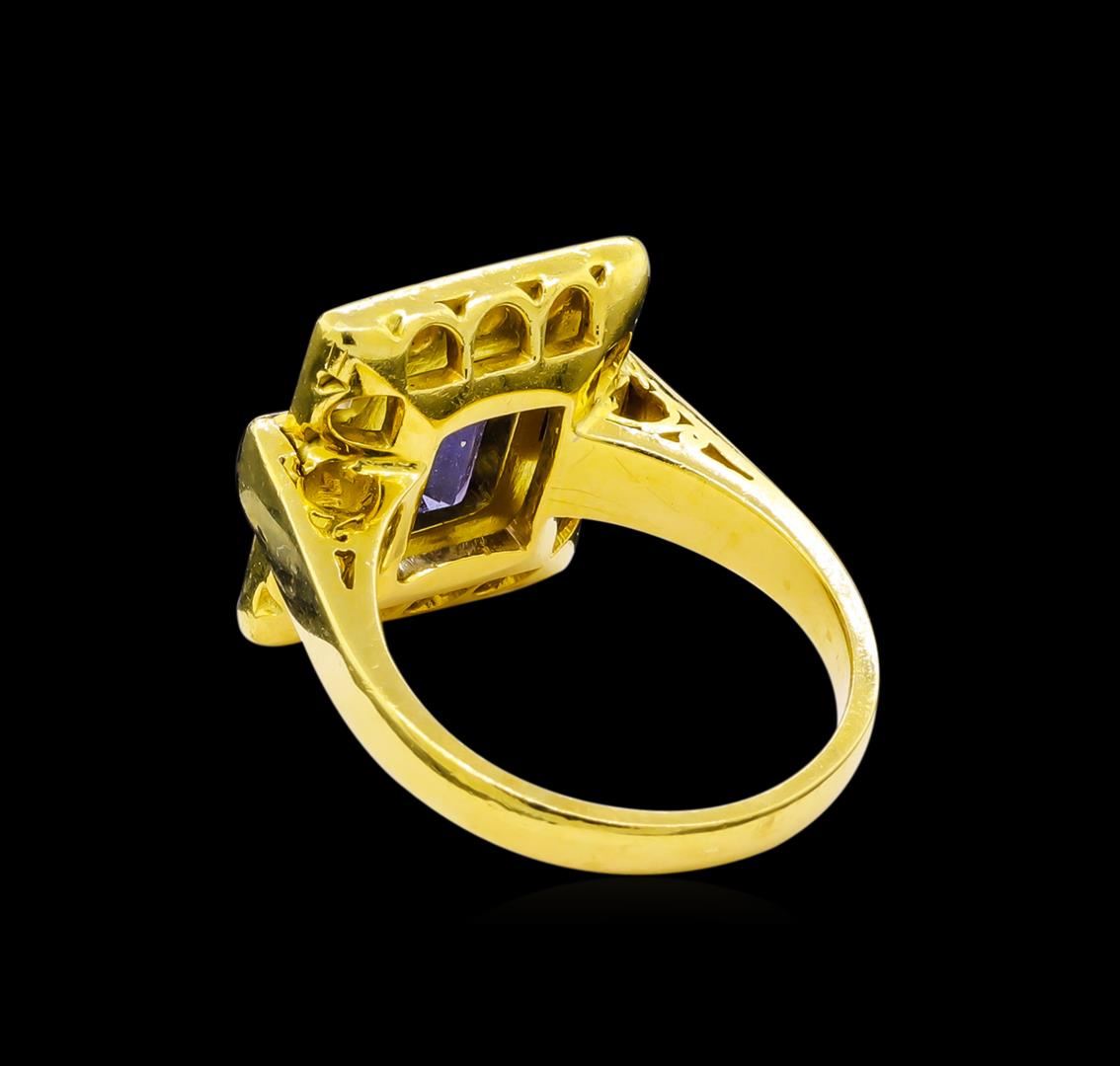 One electronically tested 18KT yellow gold lady's cast fashion ring with a halo with a bright polish finish. The featured ladies' ring has a shank measuring 2.84 millimeter in width. Identified with markings of "750". Condition is like new, good workmanship. Containing: One bezel set emerald modified step cut natural tanzanite, measuring 10.20 x 6.90 x 4.40mm, 5%. bulge factor, approximate weight of 2.94ct., clarity is eye clean, type I, medium, moderately strong, bluish violet color, (GIA bV 5/4), cut is good. Transmitting light with no distortion, transparent. Colored gemstones are presumed to have been subjected to commonly used enhancement processes. Graded in the setting. Two channel set round brilliant cut diamonds, measuring 3.00 - 2.95 x 1.88mm (depth est.) approximate total weight of 2 Stones = 0.20ct. Graded in the setting. Clarity: VS-2 to SI-1. Color: G - Good Fourteen prong set round brilliant cut diamonds, measuring 2.50 - 2.40 x 1.52mm (depth est.) approximate total weight of 14 Stones = 0.80ct. Graded in the setting. Clarity: VS-2 to SI-2. Color: G - I. Cut Good. Total Weight of Colored Stones 2.94ct. Total Weight of Diamonds 1.00ct. Total Weight of Ring 13.40gm. GAS Appraised at $9,115.00.