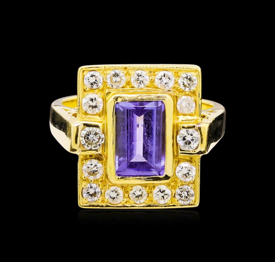 One electronically tested 18KT yellow gold lady's cast fashion ring with a halo with a bright polish finish. The featured ladies' ring has a shank measuring 2.84 millimeter in width. Identified with markings of "750". Condition is like new, good workmanship. Containing: One bezel set emerald modified step cut natural tanzanite, measuring 10.20 x 6.90 x 4.40mm, 5%. bulge factor, approximate weight of 2.94ct., clarity is eye clean, type I, medium, moderately strong, bluish violet color, (GIA bV 5/4), cut is good. Transmitting light with no distortion, transparent. Colored gemstones are presumed to have been subjected to commonly used enhancement processes. Graded in the setting. Two channel set round brilliant cut diamonds, measuring 3.00 - 2.95 x 1.88mm (depth est.) approximate total weight of 2 Stones = 0.20ct. Graded in the setting. Clarity: VS-2 to SI-1. Color: G - Good Fourteen prong set round brilliant cut diamonds, measuring 2.50 - 2.40 x 1.52mm (depth est.) approximate total weight of 14 Stones = 0.80ct. Graded in the setting. Clarity: VS-2 to SI-2. Color: G - I. Cut Good. Total Weight of Colored Stones 2.94ct. Total Weight of Diamonds 1.00ct. Total Weight of Ring 13.40gm. GAS Appraised at $9,115.00.