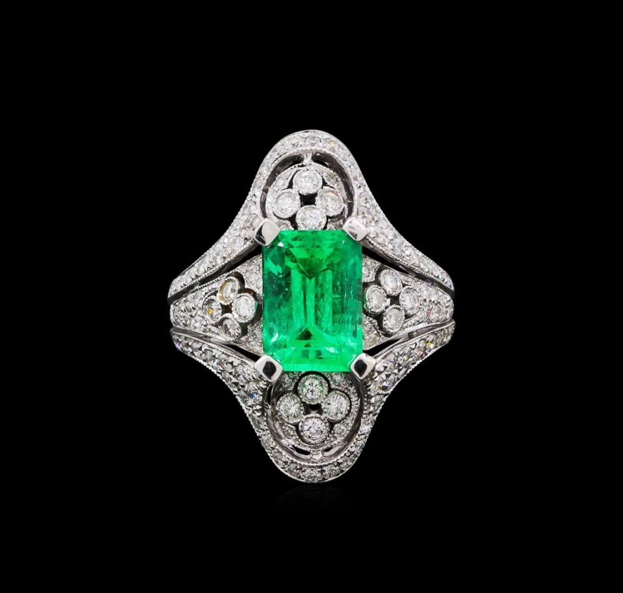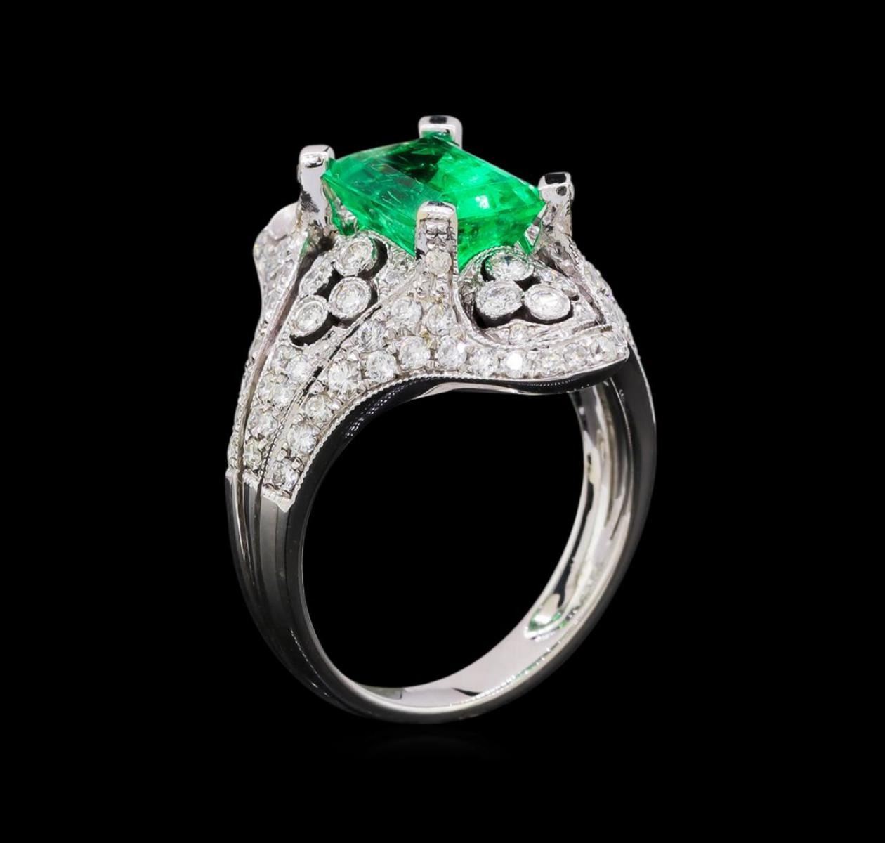 One electronically tested 18KT white gold ladies cast emerald and diamond ring. The featured emerald is set within a stylized diamond cut-out gallery supported by three-way split shoulders, completed by a three millimeter wide band. Bright polish finish with milgrain detailing. Trademark is MICHA. Identified with markings of "18K 750". Condition is good. Containing: One prong set rectangular step cut natural emerald, measuring 9.90 x 7.00. x 5.60mm, approximate weight of 2.95ct., clarity is moderately included, type III, medium dark, moderately strong, very slightly bluish green color, (GIA vslbG 6/4), cut is good. Transmitting light with a minimum of distortion, transparent. Naturally occurring internal & external characteristics are present. Indications of oil residue. Graded in the setting. Twenty prong & bezel set round brilliant cut diamonds, measuring 1.60 - 1.50 x 0.93mm (depth est.) approximate total weight of 20 Stones = 0.30ct. Graded in the setting. Clarity: SI-1 to I-1 . Color: F - H Seventy prong set round brilliant cut diamonds, measuring 1.50 - 1.10 x 0.78mm (depth est.) approximate total weight of 70 Stones = 0.60ct. Graded in the setting. Clarity: SI-1 to I-1 . Color: F - H Twenty-Four prong set round brilliant cut diamonds, measuring 1.00. - 0.80 x 0.54mm (depth est.) approximate total weight of 24 Stones = 0.10ct. Graded in the setting. Clarity: SI-2 to I-2 . Color: F - H. Total Weight of Colored Stones 2.95ct.. Total Weight of Diamonds 1.00ct.. Total Weight of Ring 7.76gm. AIG Appraised.